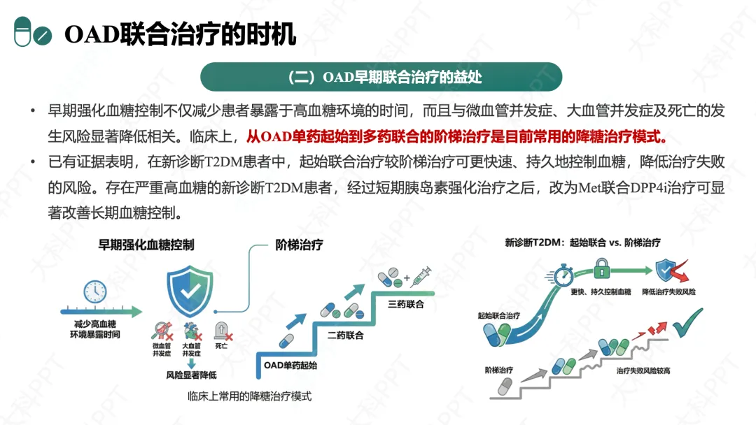 启动联合治疗的 HbA₁c 水平无统一标准,《中国糖尿病防治指南(2024 版)》推荐单药治疗 HbA₁c≥7% 且排除非药物因素后启动二联,3 个月不达标则三联;部分指南建议初始 HbA₁c≥7.5% 可直接起始二联,≥9% 或高于目标值 1.5% 需即刻联合。早期联合治疗益处显著,能快速、持久控制血糖,降低治疗失败风险,减少高血糖暴露时间,降低微血管、大血管并发症及死亡风险,新诊断严重高血糖患者经短期胰岛素强化后,可改为 Met 联合 DPP4i 等 OAD 治疗。