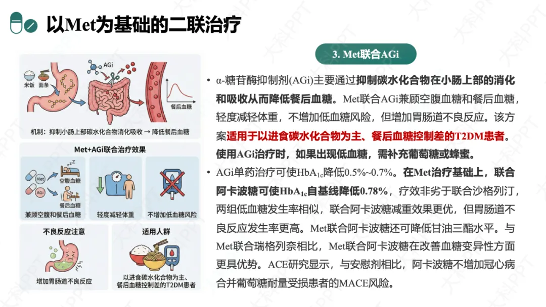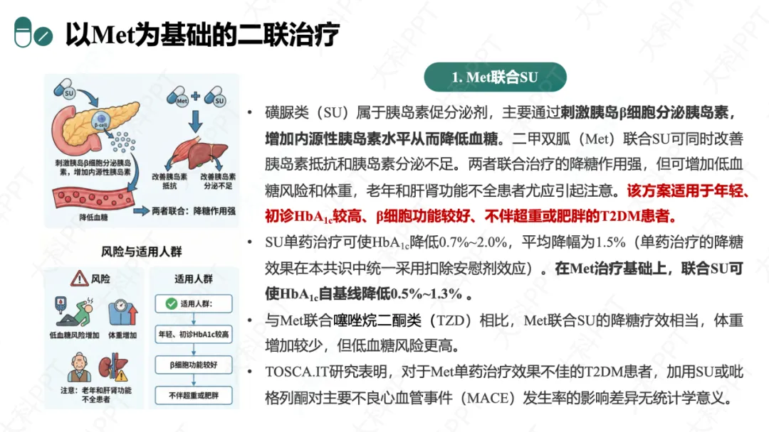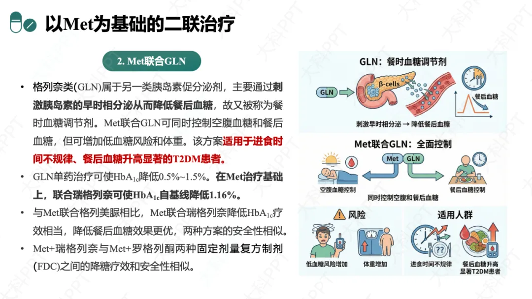 以 Met 为基础的方案中,Met+SU 降糖强,适用于年轻、初诊 HbA₁c 较高、胰岛 β 细胞功能好且不肥胖者,但低血糖和体重增加风险高;Met+GLN 兼顾空腹与餐后血糖,适用于进食不规律、餐后血糖升高显著者;Met+AGi 轻度减重、无低血糖风险,适合碳水化合物摄入多、餐后血糖控制差者;Met+TZD/pan-PPARA 改善胰岛素抵抗,适用于胰岛素抵抗明显者;Met+DPP4i 安全性佳,适合老年、低血糖高风险者;Met+GLP-1RA/SGLT2i 兼具降糖与心肾保护 / 减重作用,适合合并 ASCVD、CKD 或超重肥胖者;Met 为基础的 FDC 可简化方案,提升依从性。