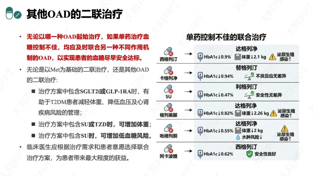 其他 OAD 二联方案(如西格列汀 + 达格列净)也可实现血糖达标,但需关注泌尿生殖系感染等不良反应,临床需根据患者特征选择方案。(仅展示部分ppt)