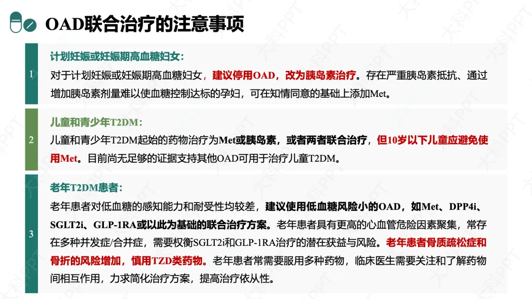 老年患者优先选用低血糖风险低的药物(如 Met、DPP4i 等),需权衡 SGLT2i/GLP-1RA 的获益与风险,慎用 TZD,同时简化方案、关注药物相互作用。