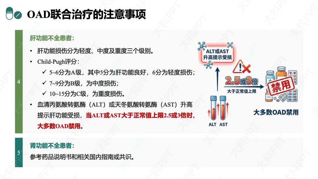 肝功能不全患者按 Child-Pugh 分级用药,ALT/AST 超过正常值上限 2.5 或 3 倍时,多数 OAD 禁用。
