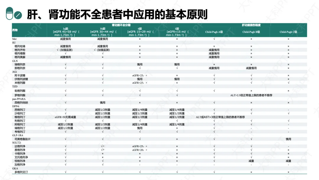 肾功能不全患者需根据 eGFR 调整用药,如 Met 在 eGFR<45 ml/(min・1.73m²)时减量或禁用,SGLT2i 在 eGFR<45 ml/(min・1.73m²)时降糖效果减弱,但 eGFR≥20 ml/(min・1.73m²)时可保留用于器官保护。