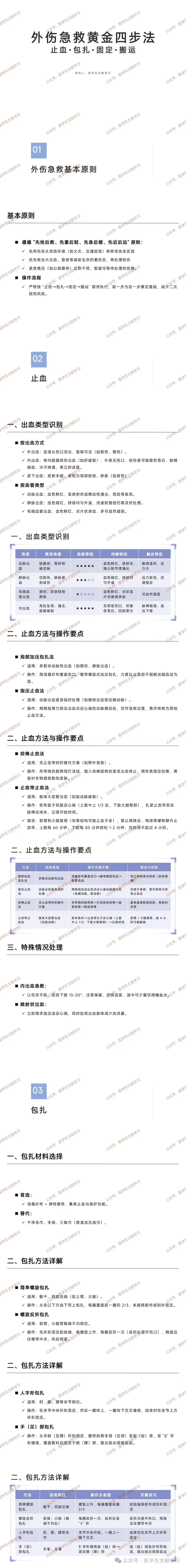 操作流程:严格按 “止血→包扎→固定→搬运” 顺序执行,前一步为后一步奠定基础,减少二次损伤风险。