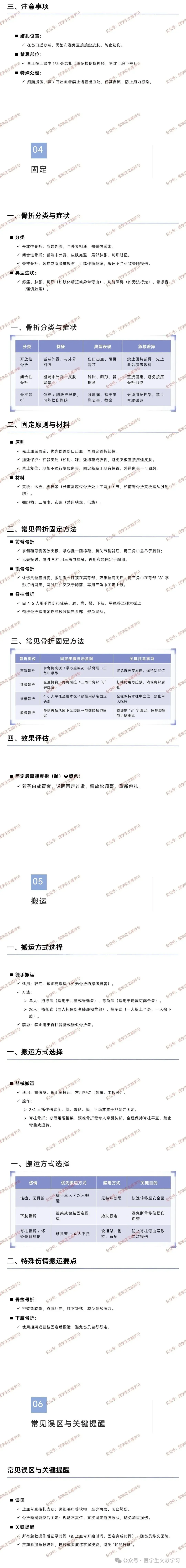 误区:止血带直接扎皮肤(需垫至少两层软物);骨折断端复位后固定(现场不复位,直接固定原状)。