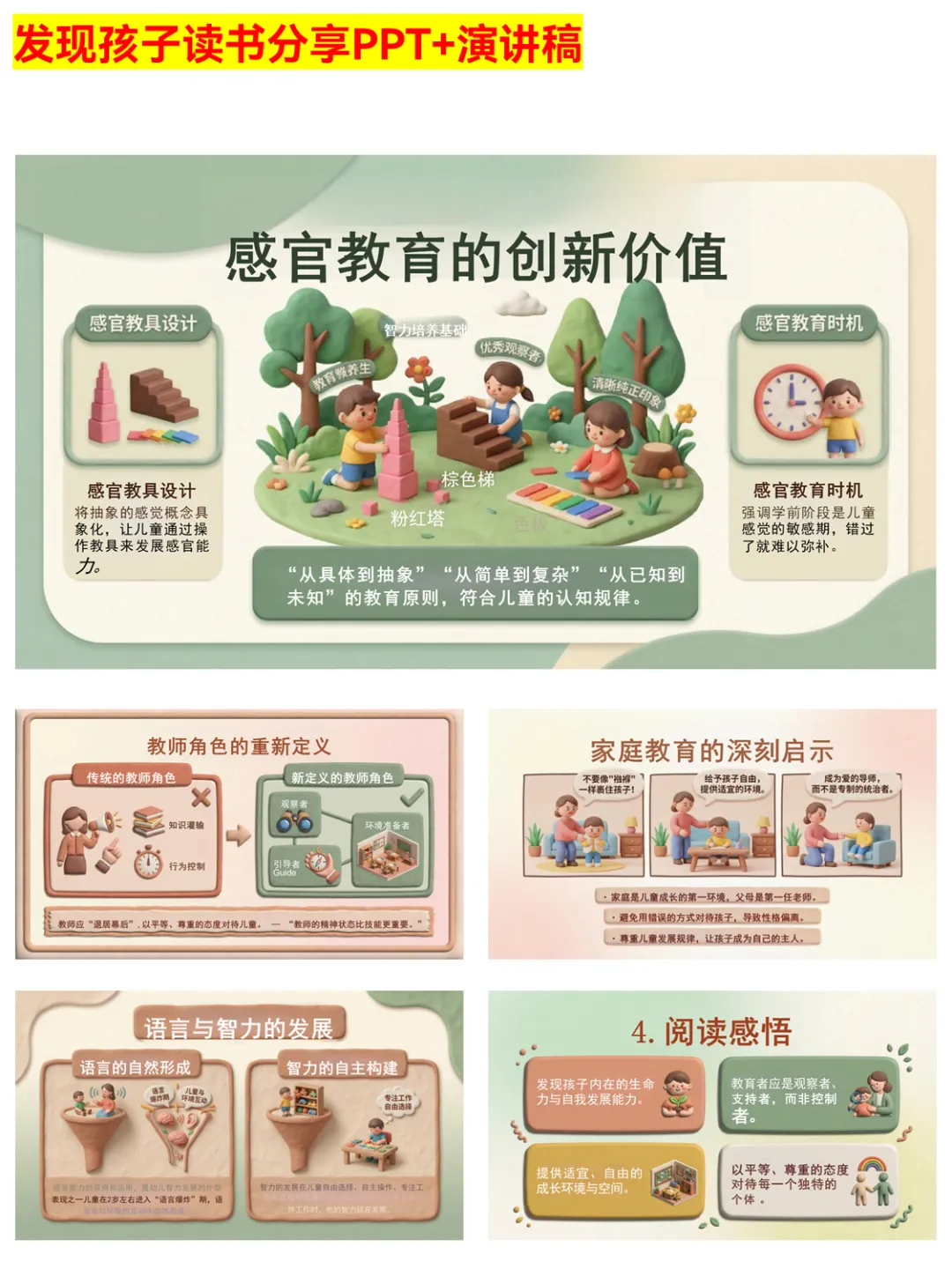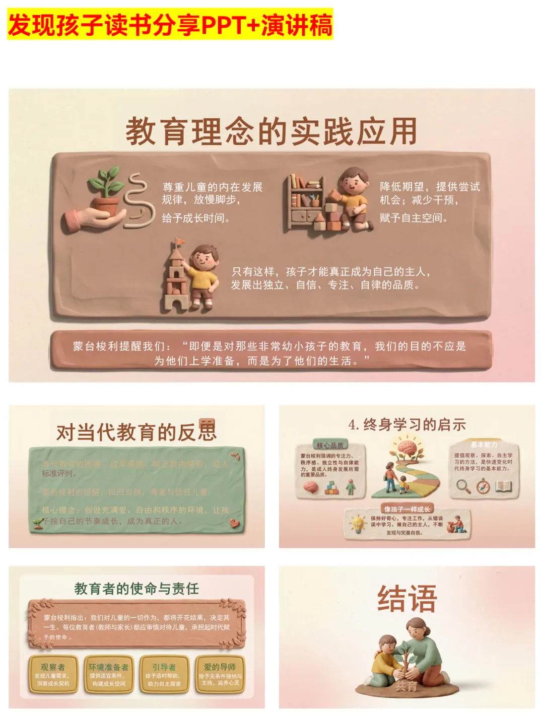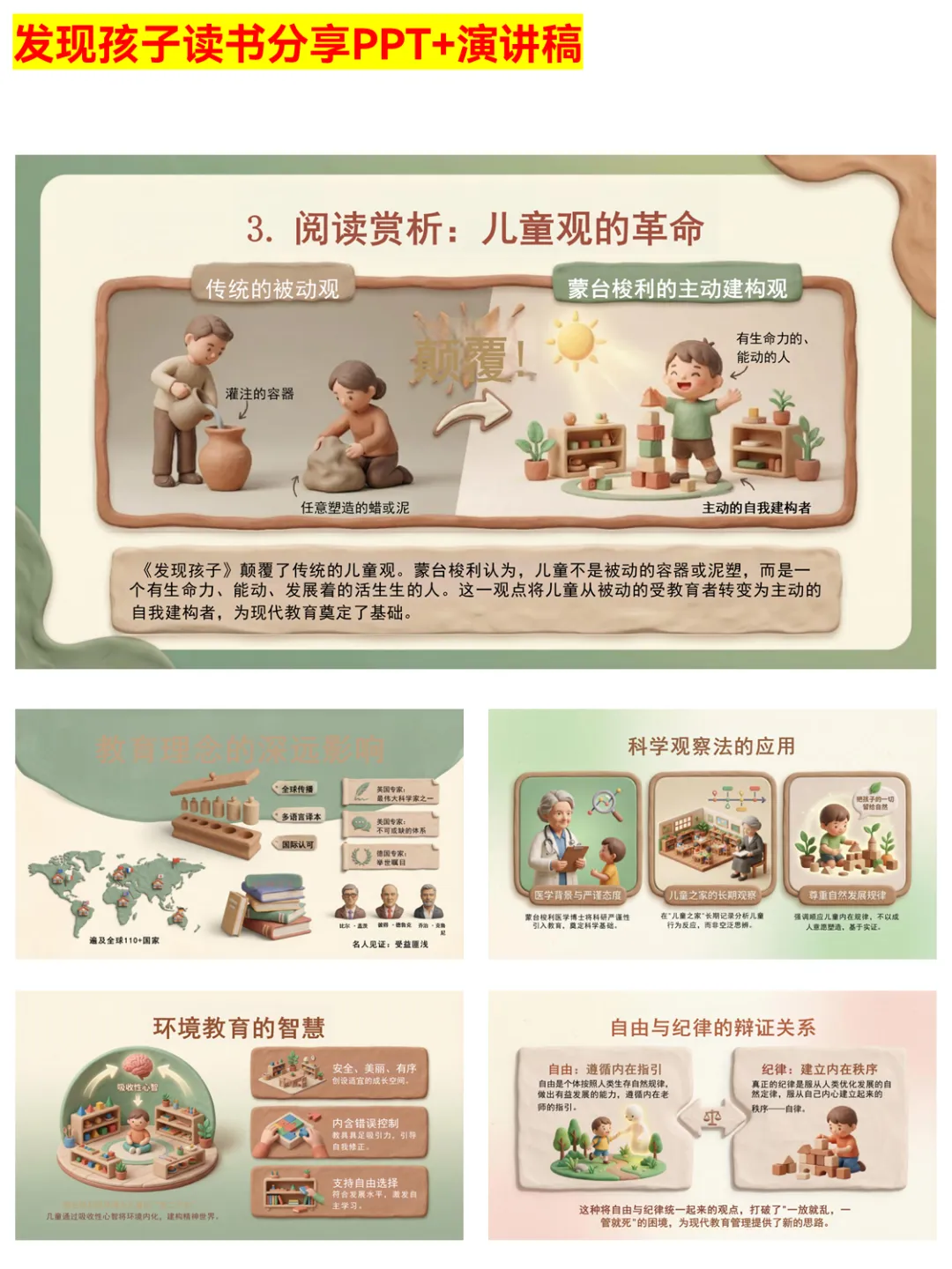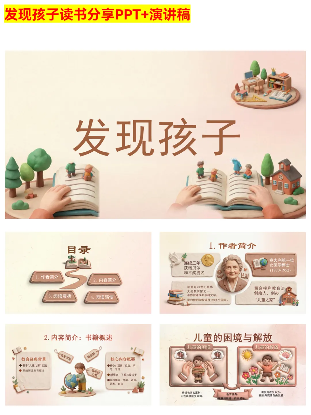 想要做好读书分享?这份《发现孩子》PPT绝对是教师成长的好帮手!PPT结构清晰,从作者简介、内容简介,到阅读赏析、阅读感悟,层层递进。详细介绍了蒙台梭利的教育革命,包括儿童观的颠覆、环境教育的智慧、教师角色的转变等。还梳理了智力发展与自由选择的关系,以及终身学习的启示,为教师提供了丰富的分享素材和教育思路。无论是校内读书分享会,还是个人教学反思,都能派上大用场。 #教师成长 #发现孩子 #读书分享PPT #蒙台梭利教育法 #教育分享 #教学反思 #儿童观 #教师角色 #教育干货 #读书打卡