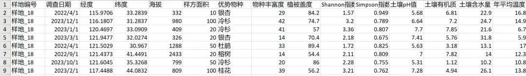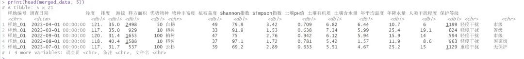 # 保存到桌面output_file <- "C:/Users/Desktop/合并后的生态学数据.xlsx"write_xlsx(list("合并数据" = merged_data), output_file)# 预览前5行print(head(merged_data, 5))