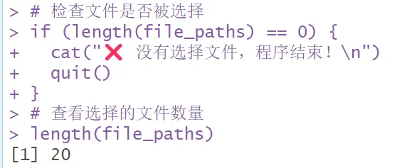 # 检查文件是否被选择if (length(file_paths) == 0) { cat("❌ 没有选择文件,程序结束!\n") quit()}# 查看选择的文件数量length(file_paths)