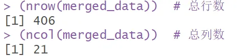 (nrow(merged_data)) # 总行数(ncol(merged_data)) # 总列数