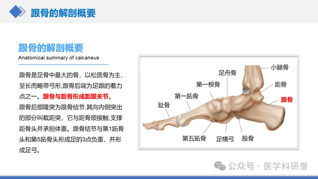 跟骨,作为人体足部最大的跗骨,承载着重要的支撑和运动功能。其解剖结构复杂,具有多个关节面,后跟部主要由松质骨构成,而前、中部则由相对致密的皮质骨组成。这种独特的结构使得跟骨在承受身体重量和提供足部运动时起到关键作用。