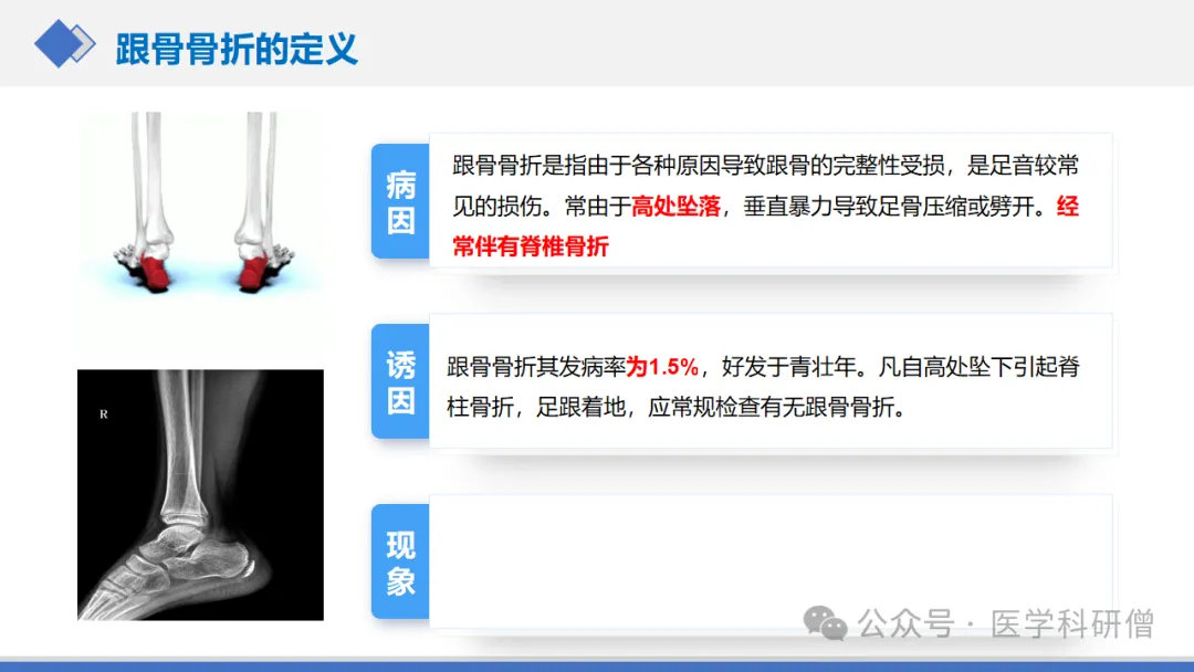 跟骨骨折,指的是由于外力作用导致的跟骨完整性或连续性的中断。这种骨折常见于高空坠落或车祸等事故中,足部受到强烈冲击而损伤。
