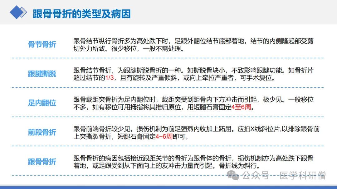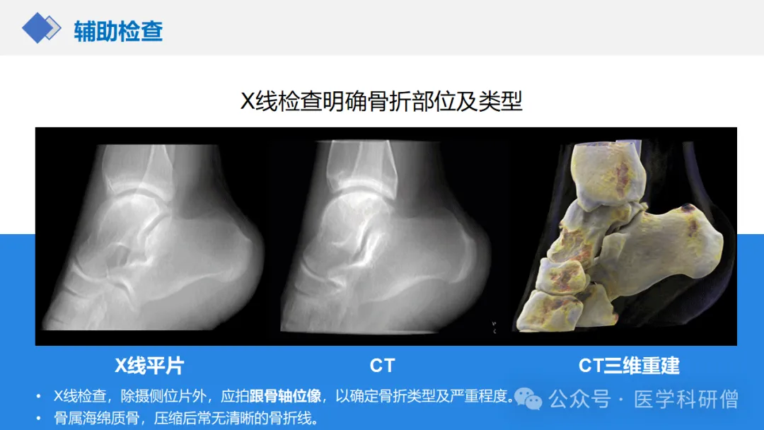 • X线检查是诊断跟骨骨折的常用方法,可以明确骨折的部位和类型。