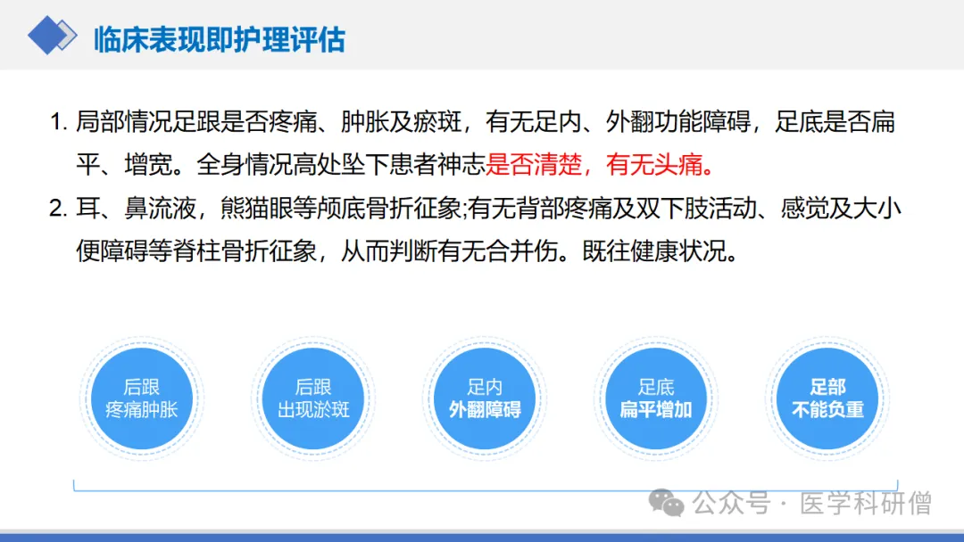 局部情况:患者通常会出现足跟疼痛、肿胀、瘀斑等症状。同时,足内、外翻功能障碍,足底扁平、增宽也是常见的临床表现。在护理评估时,应密切观察这些症状的变化,以及是否有感染等并发症的迹象。