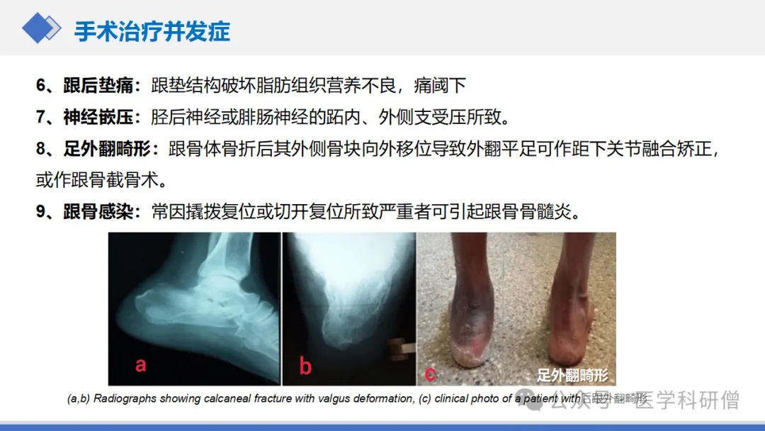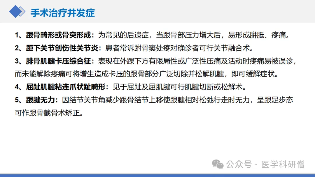 然而,手术治疗也可能带来一些并发症,如跟骨畸形、距下关节创伤性关节炎和腓骨肌腱卡压综合征等。因此,在选择手术治疗时需要谨慎评估患者的具体情况,并在术后给予适当的护理和康复指导。