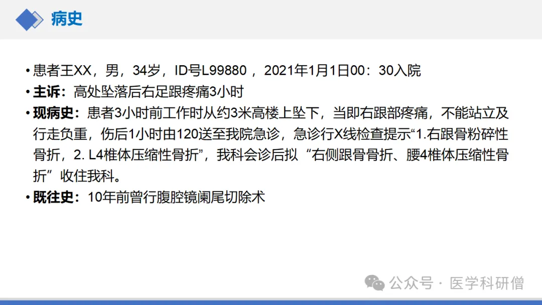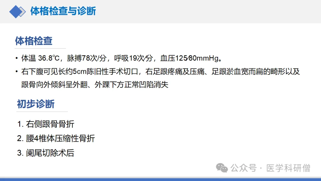 初步诊断:结合患者病史、体格检查和影像学检查,初步诊断为“右侧跟骨骨折”。同时,患者还伴有腰4椎体压缩性骨折(考虑为高空坠落时同时受伤)和阑尾切除术后(既往史)。