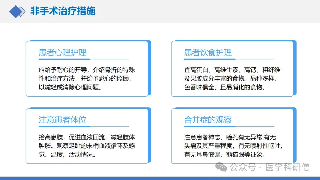 1. 给予镇痛药物控制疼痛:患者术后疼痛得到明显缓解能够保持良好的睡眠质量有利于伤口愈合和骨折愈合;