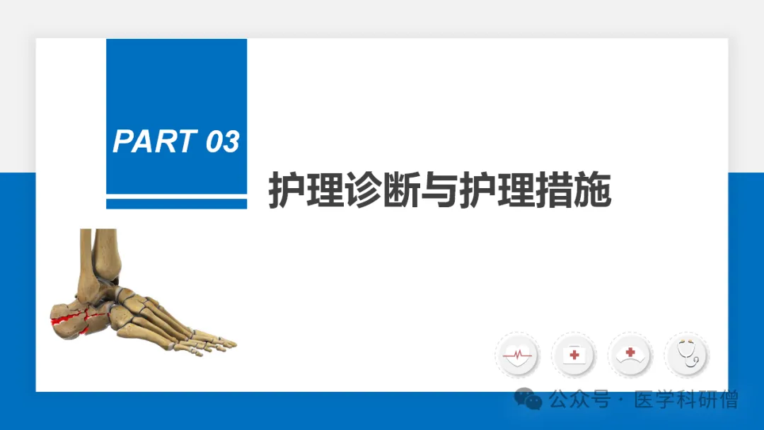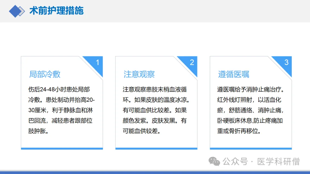 体位护理:术后患者应卧床休息并抬高患肢以促进血液回流减轻肿胀和疼痛。可根据患者的舒适度调整卧床体位并定期翻身以防止压疮的发生。