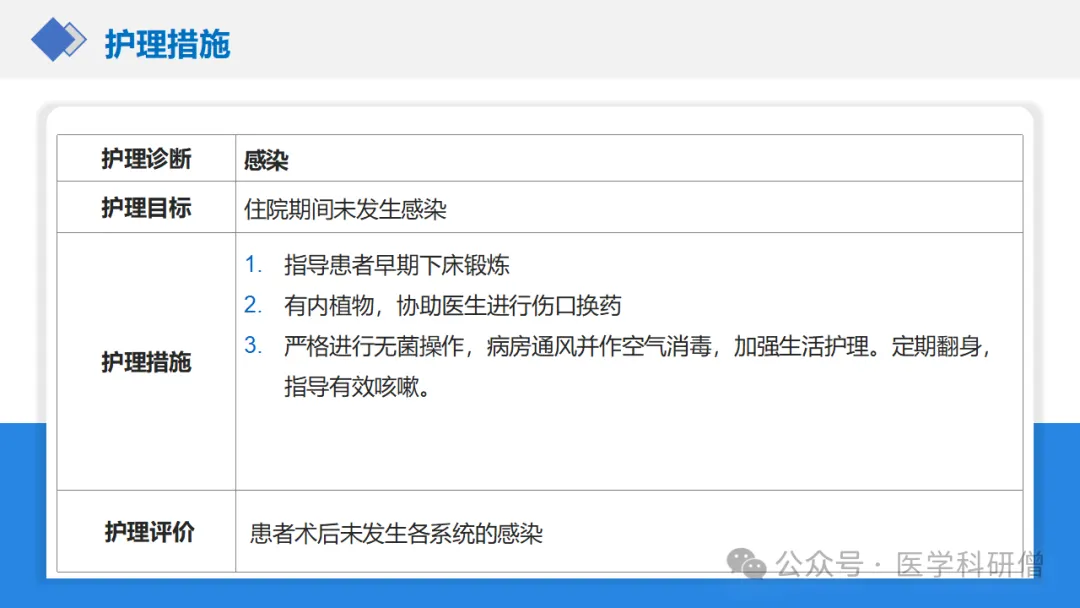 手术切口观察:保持手术切口的清洁干燥是预防感染的关键。应定期观察切口敷料情况并及时更换污染的敷料。同时注意观察切口有无红肿、渗液等感染征象。