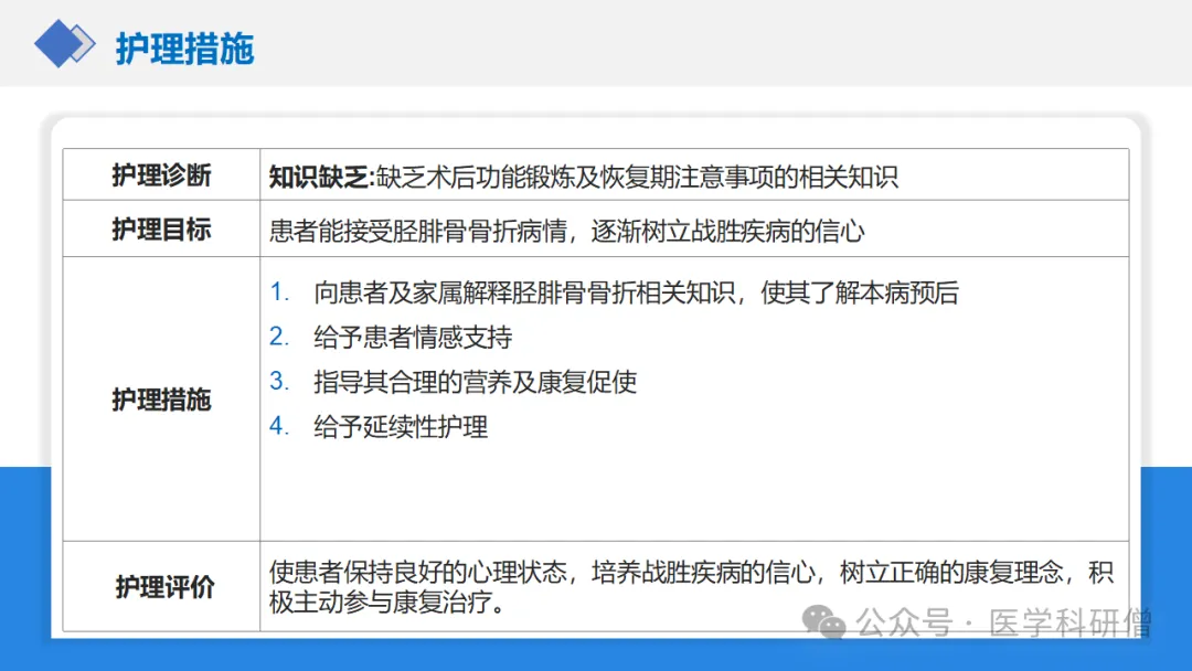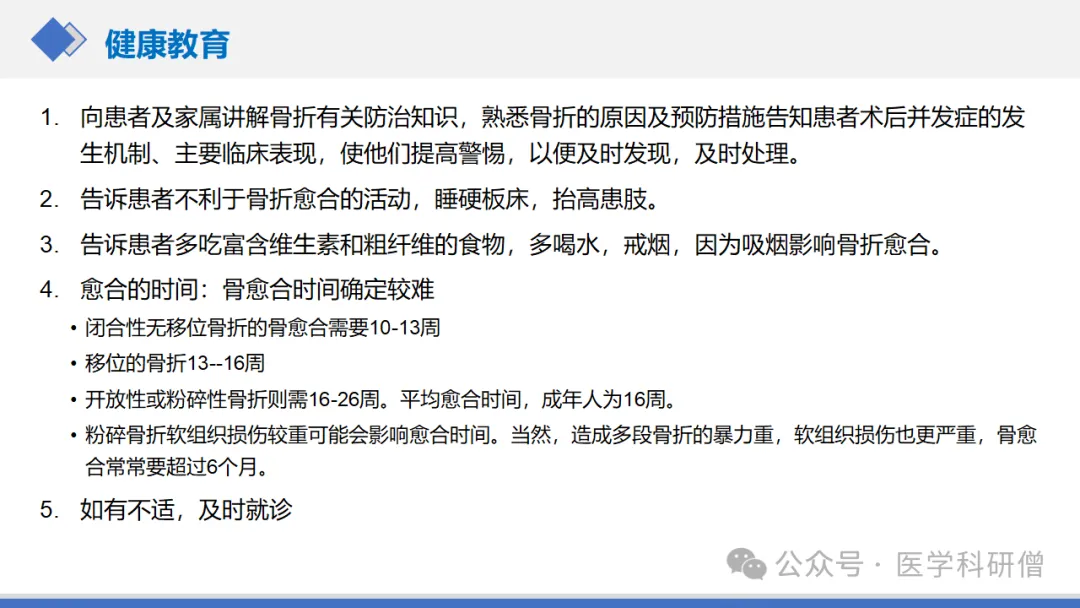其次,教育患者如何预防术后并发症。这包括保持伤口清洁干燥以防止感染,定期进行适度的活动以防止下肢深静脉血栓的形成,以及避免过早负重以防止骨折移位等。