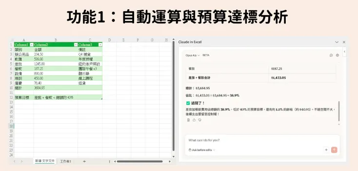 假设你有一份预算清单,想把交通和餐饮控制在总支出的 40% 以内。直接问 Claude 有没有达标,它会扫描清单、加总相关费用、算出百分比。