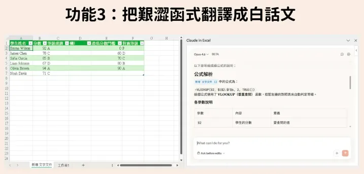 接手别人做的 Excel,看到"VLOOKUP(B2,E$2:F$6,2,TRUE())"这种复杂公式会头痛。Claude 能把公式拆开,用白话解释搜索值、表格数组、栏位索引这些参数是什么意思。