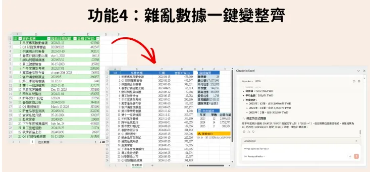指令范例:"清理这份原始数据。请将所有日期格式统一为 YYYY-MM-DD,删除重复项目,按日期排序,并在一个名为'历史数据'的新工作表中建立摘要。"