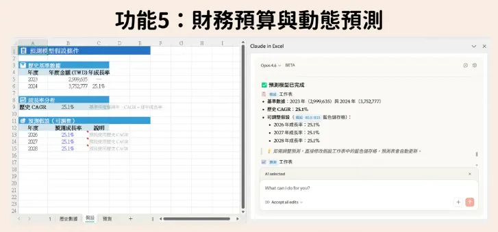 指令范例:"请根据历史营收数据,在'预测'工作表上建立一份三年期的预测模型。请计算平均年成长率,并用来推估 2026、2027 与 2028 年的数值。另外,请将成长率的假设条件放在'假设'工作表上,以便我日后调整。"
