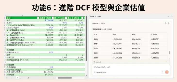 针对专业财务需求,Claude 可以建构 DCF(现金流量折现模型)。只要提供折现率和终值成长率等参数,它就能自动推算未来现金流、算出企业估值。