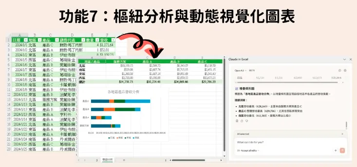 Claude 简化了 Excel 的"枢纽分析表"功能。只要描述你想要的维度(比如依地区和产品分类的总营收),它就会自动设定列与栏的对应关系。