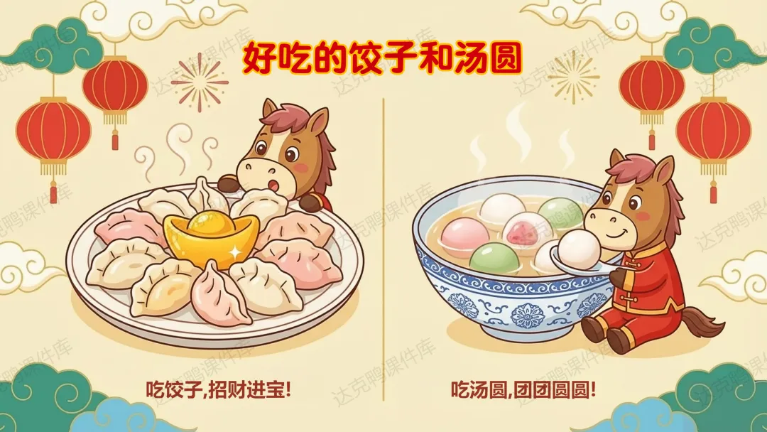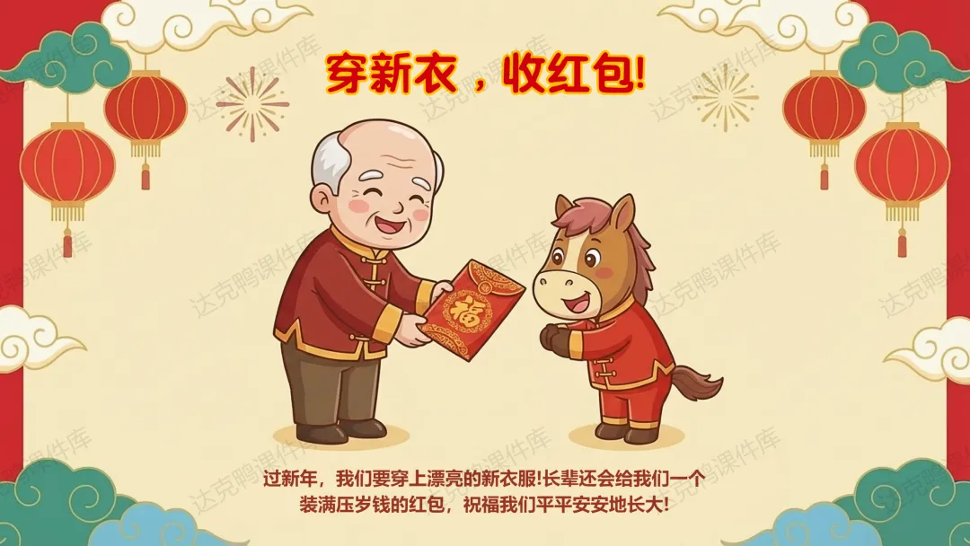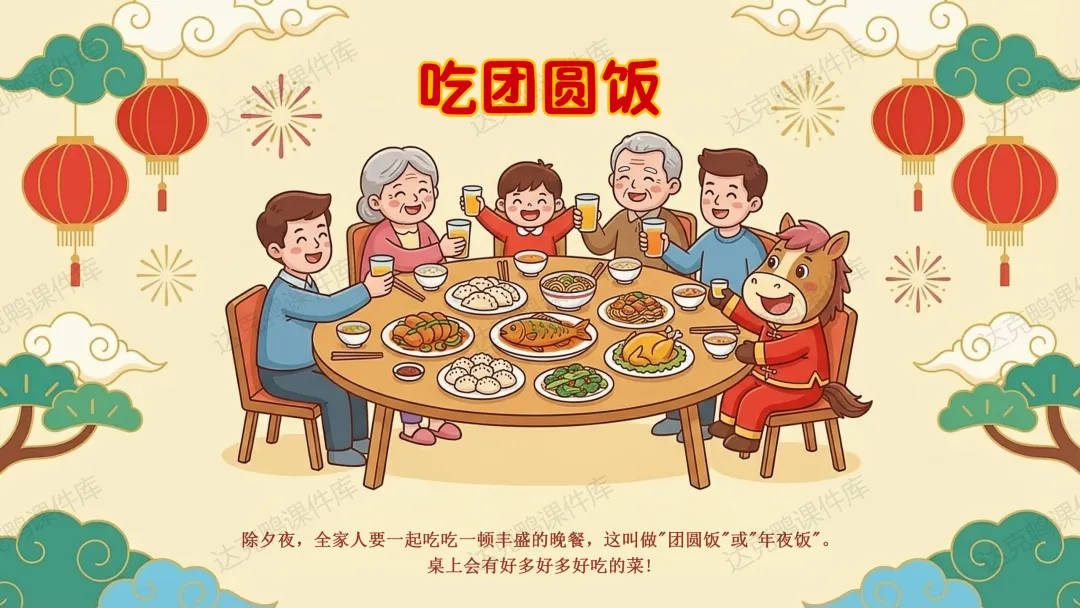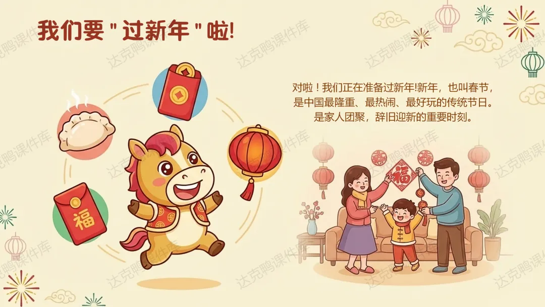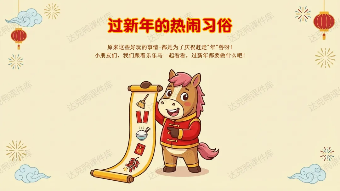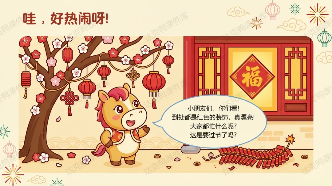 认知目标:理解"春节"的含义,知道"年"的传说故事及怪兽的三个弱点(红色、火光、响声);了解扫尘、吃年夜饭等习俗的寓意。