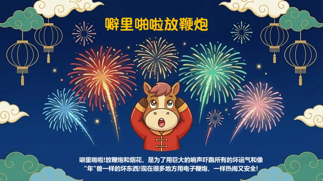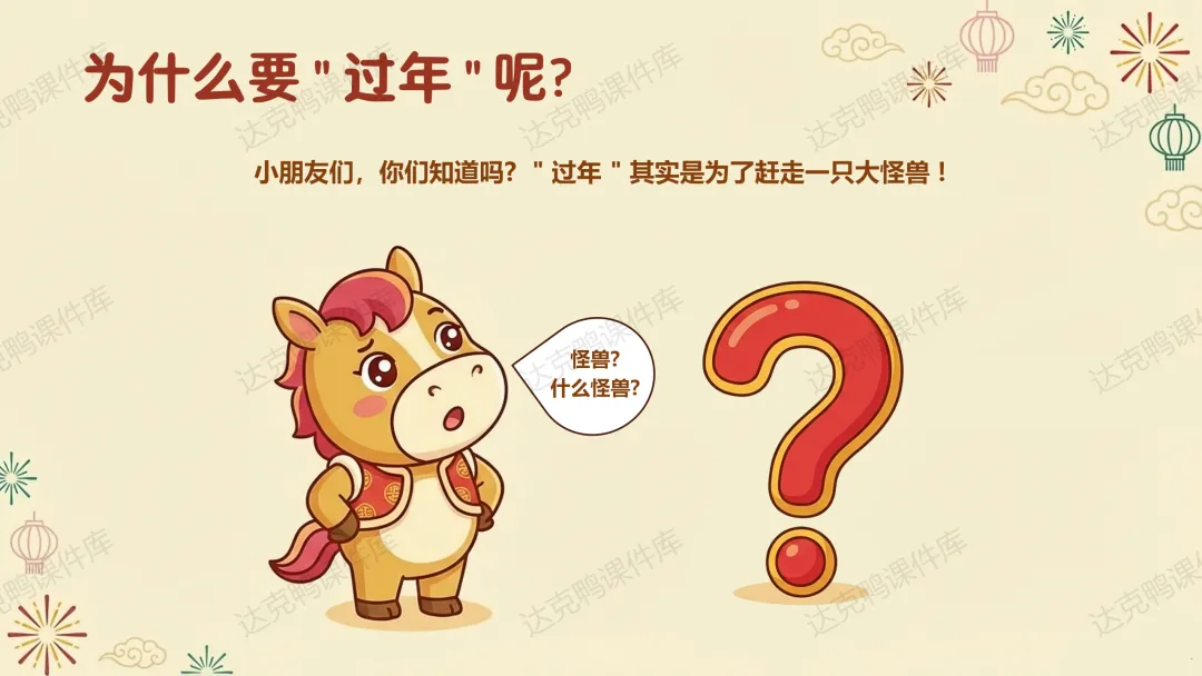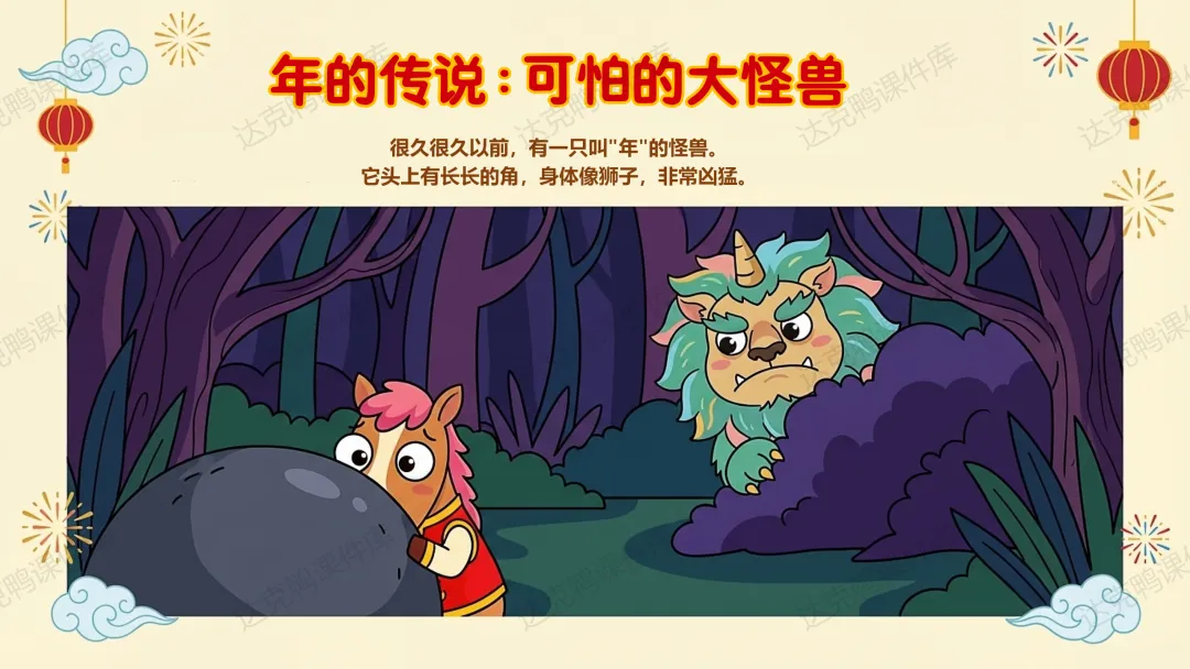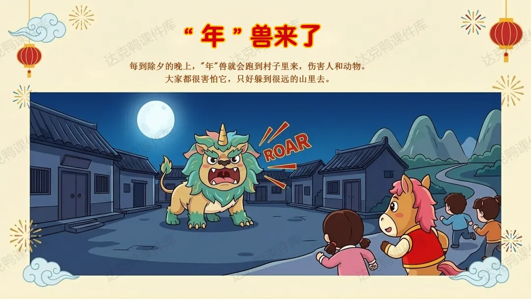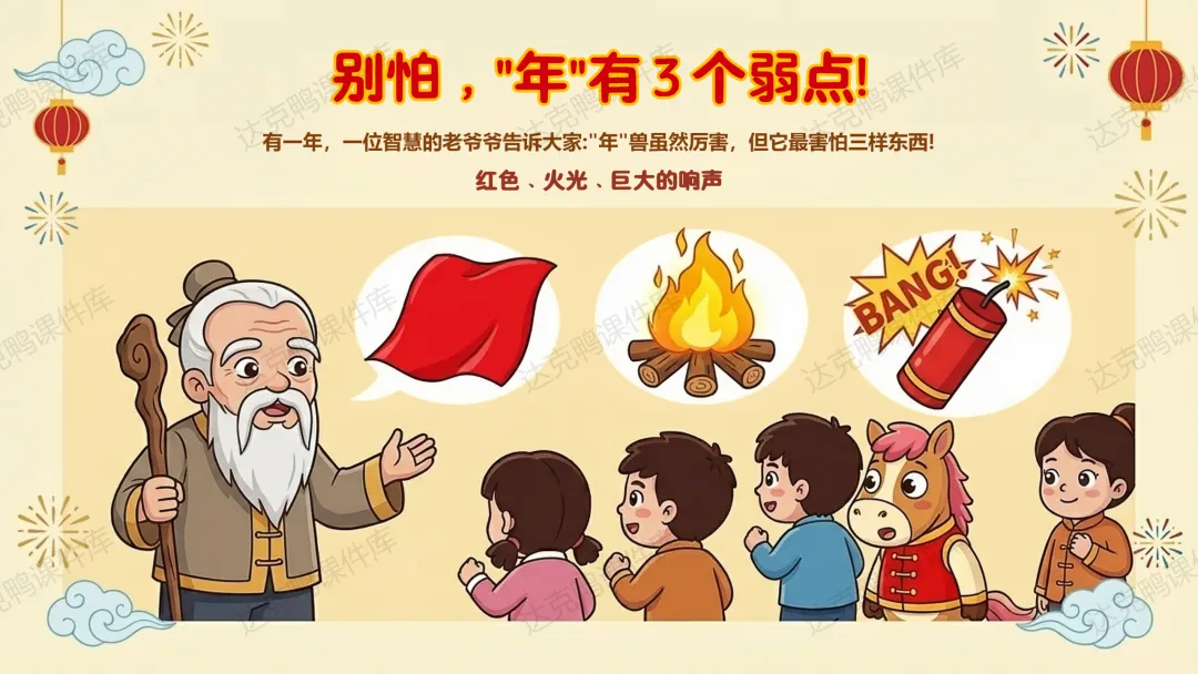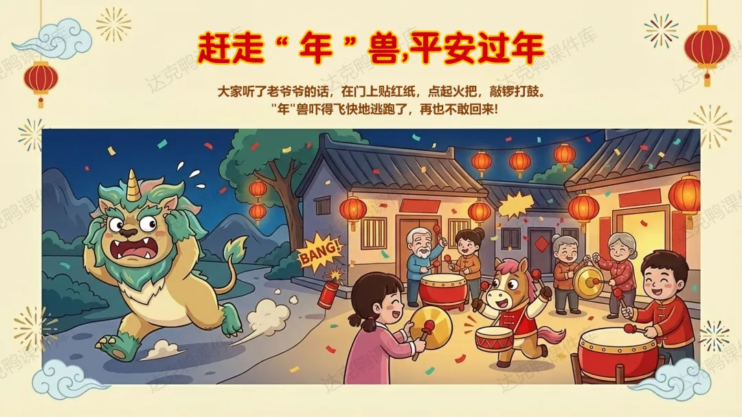 重点:讲述"年"的传说,掌握驱赶年兽的三种方法(贴红纸、点火把、敲锣打鼓)。