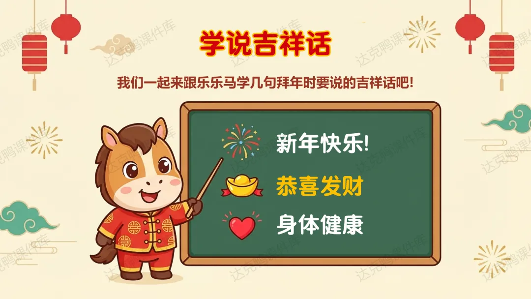 能力目标:能用肢体语言模拟赶走"年"兽的动作;能大胆表达自己对新年的喜爱和祝福。