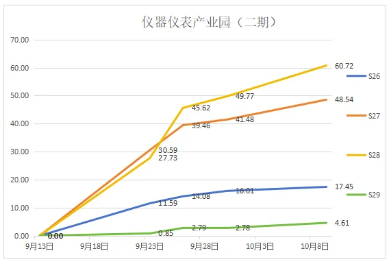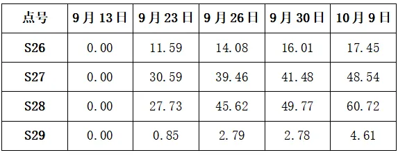 3.2.1、10月09日S27号、S28点累计水平位移量分别为48.5mm、60.7mm,变形速率分别为0.9mm/d、1.4mm/d;变形量持续增加未收敛;超出预警值40.0mm的21.25%、51.75%,需重点关注该区域支护结构稳定性。