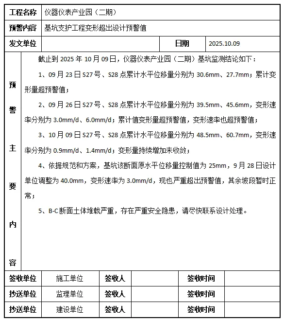 以预警联系单形式汇总监测数据的具体发展情况,提出相应的预警信息及处理建议,并由各参建单位负责人签字确认,完成交接手续。