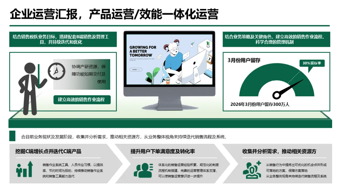 材料以 “问题 - 方案 - 成果 - 规划” 为核心逻辑,拆解了从产品研发、IP 打造到用户转化的全链路打法,包含木桶效应分析、流量漏斗模型、超级 IP 建设路径等经典工具,同时覆盖企业战略、跨部门协同、项目管理、业绩拆解等多层级内容。无论是市场、销售、研发等职能部门,还是职场新人与管理者,都能找到适配的汇报逻辑与业务落地方法,实现汇报质量与工作效能的双重提升。