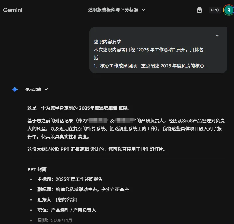 很多人觉得AI生成的PPT像废话,是因为你把它当成了搜索框。如果你完全没思路:把你的岗位职责、KPI要求丢给Gemini,然后给它设定一个“顶级专家”的人设:提示词参考:“你现在是一个拥有20年大厂经验的[产研/运营/销售]负责人,请站在资深管理者的视角,为我梳理一份2025年述职报告的最优框架。要求:避开大话空话,突出业务闭环和增长逻辑,去AI味。”