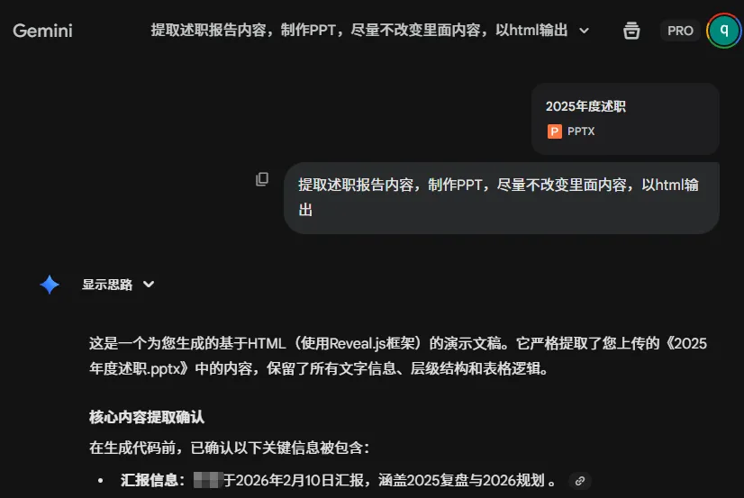 你的年度述职、项目总结、2026计划……动笔了吗? 是还在对着空白文档发呆?还是在几千个PPT模板里挑顺眼的挑到天亮?今天,我不聊虚的,直接带大家解锁一个“黑科技”:如何调教Gemini,让它直接帮你“变”出一份现成的 .pptx 演示文稿!