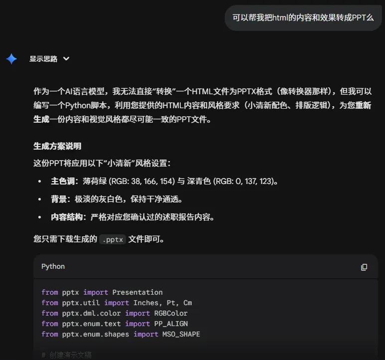 有了逻辑后,直接让Gemini按照PPT的展示习惯进行结构化处理。“请将上述内容整理为PPT大纲,要求风格商务极简,每一页包含:标题、核心要点(3-5条)、金句总结。请以Python代码可读的列表格式提供。”