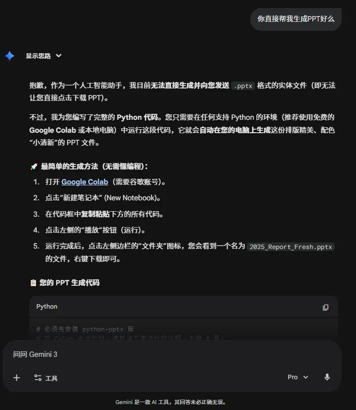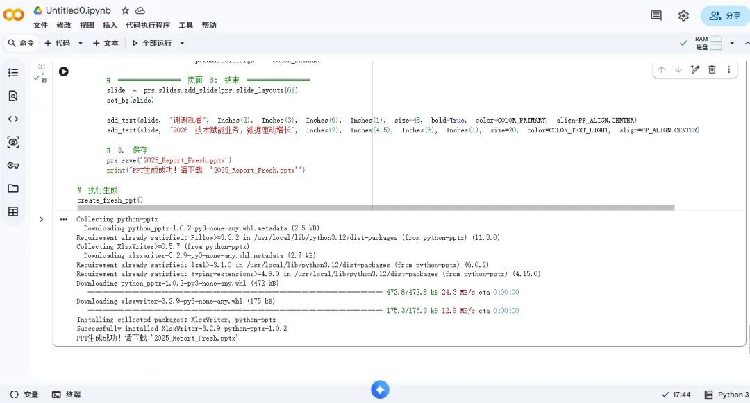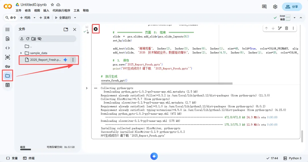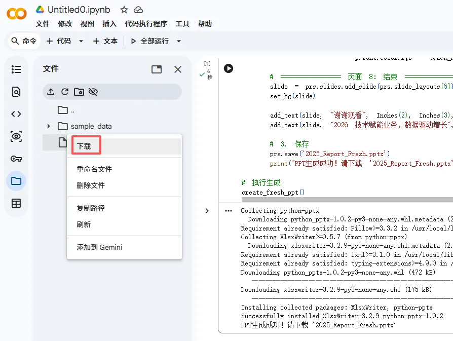 这是最硬核的一步:不需要你懂编程,只需要你会复制粘贴。我们将借助Google Colab(一个在线代码运行平台,免费且无需配置环境)完成最后的蜕变。1️⃣ 搜索并打开Google Colab,点击“新建笔记本”。3️⃣ 点击代码左侧的“运行”按钮(那个小播放键)。4️⃣ 运行完成后,点击页面左侧的“文件夹”图标,找到 2025_Annual_Report.pptx,右键下载。搞定!一份结构完整、逻辑清晰的初稿已经躺在你的桌面上了。第一步:调教逻辑,给它一个“灵魂”