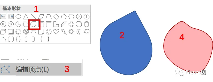 1、插入泪滴形状,使用编辑顶点工具调整整体形状得到下图4的心脏轮廓;插入的形状不是单一的,也可以使用曲线工具逐渐加点,形成轮廓后细微调整;