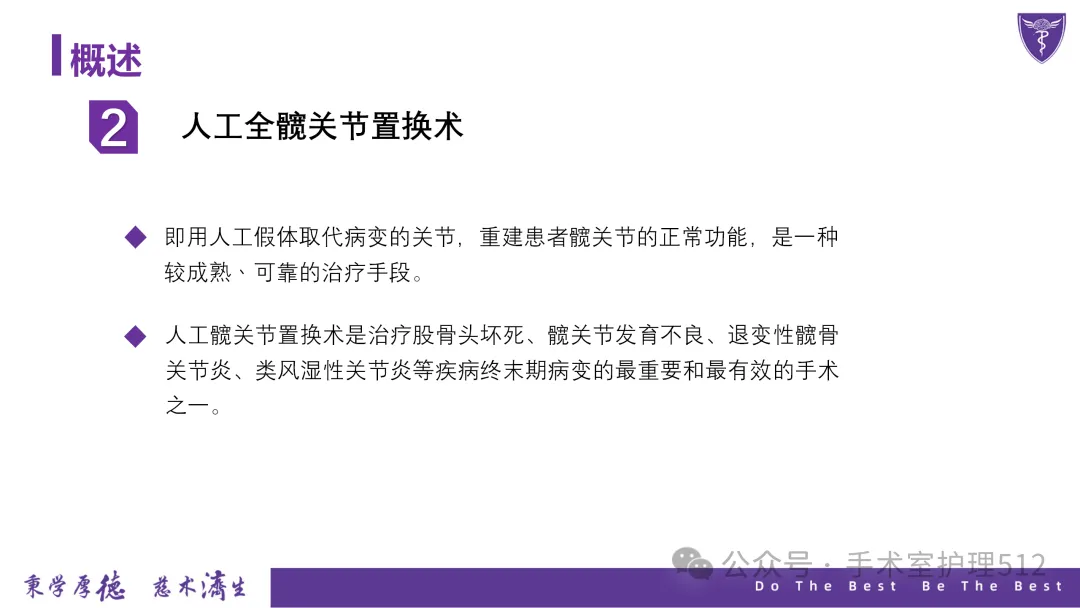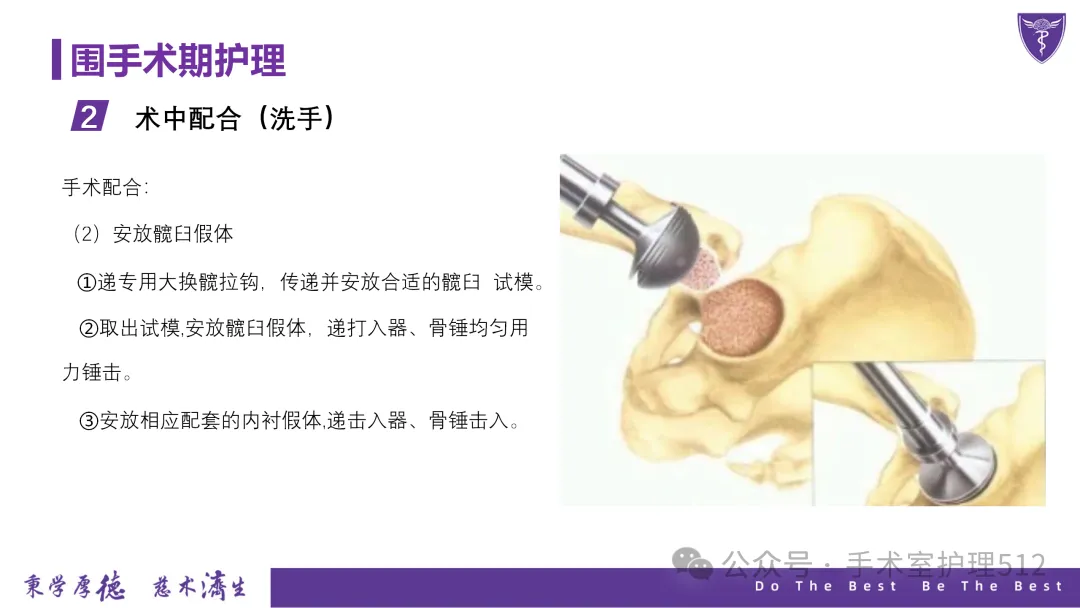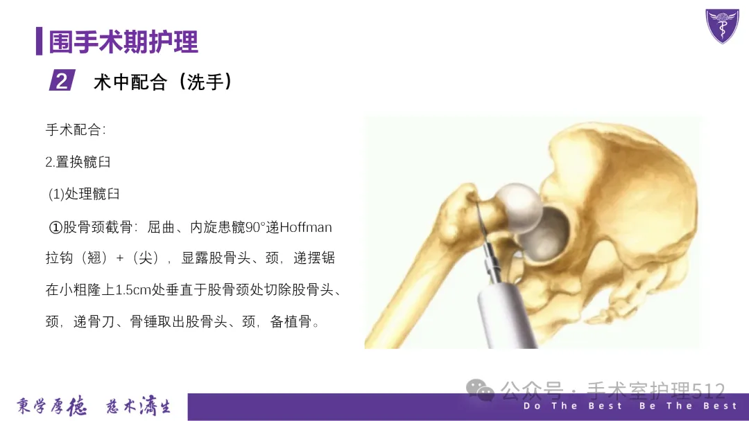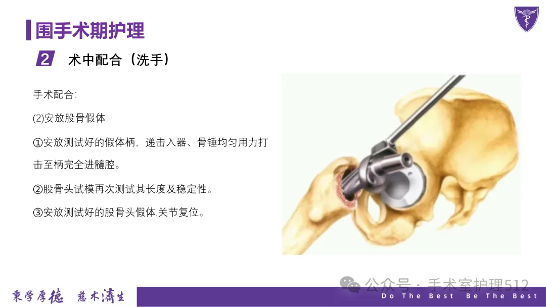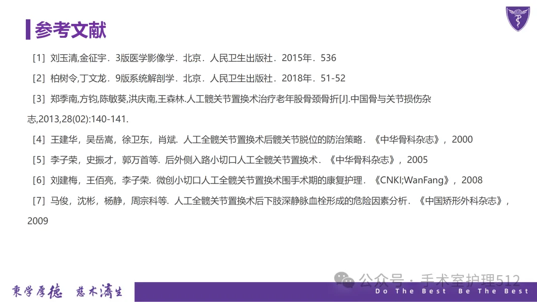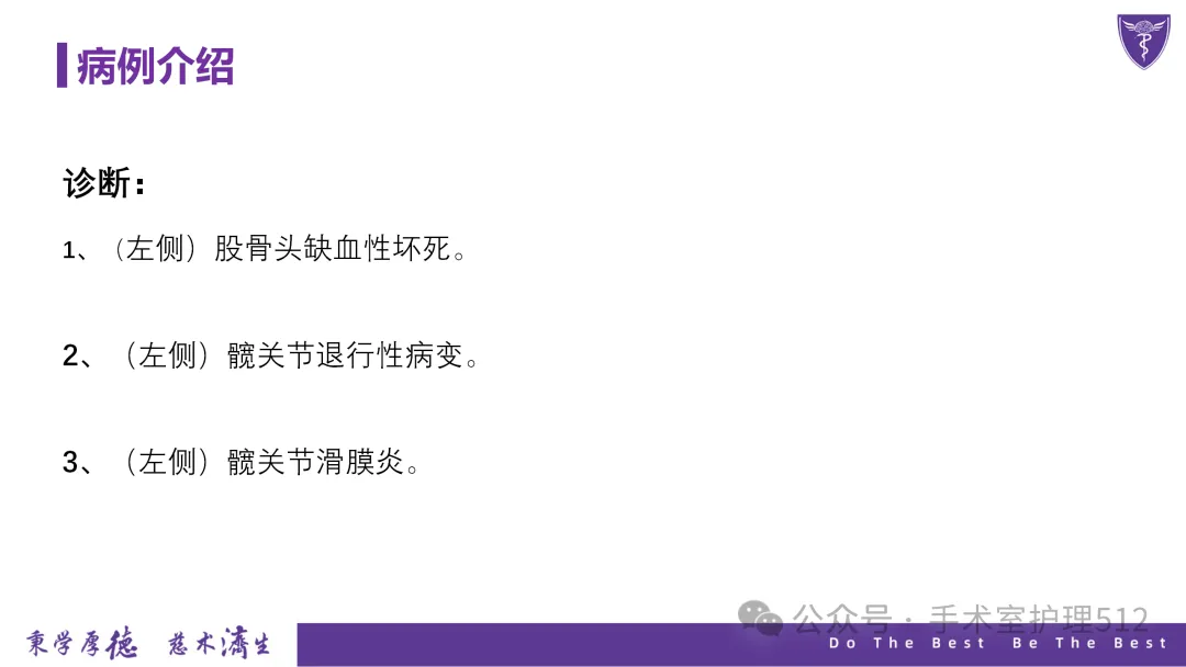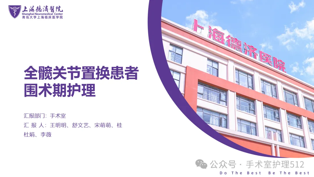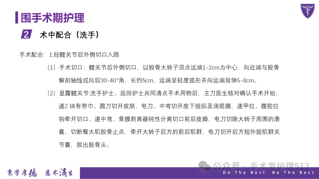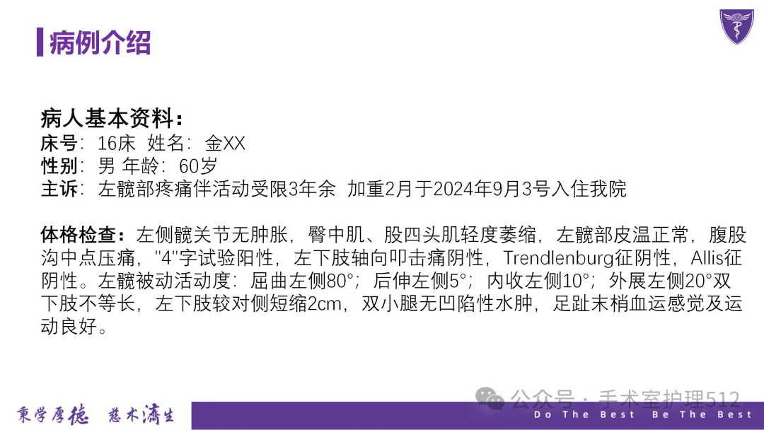 该PPT具体描述了全髋关节置换患者的围术期护理,以我院的一例具体病例介绍,围绕髋关节患者的术前护理、术中手术配合、术后护理以及康复锻炼、并发症的预防等展开介绍,尤其侧重介绍手术室工作内容,髋关节置换术的手术配合,从术前物品准备、术中巡回护士、洗手护士的配合工作,以及术后的护理重点分类做了详细介绍。此类PPT也有助于手术室的临床教学工作,帮助新入职员工在入职初期学习掌握专科知识。