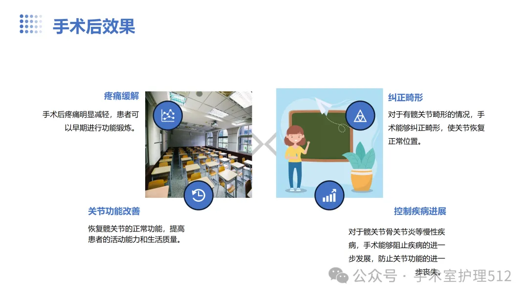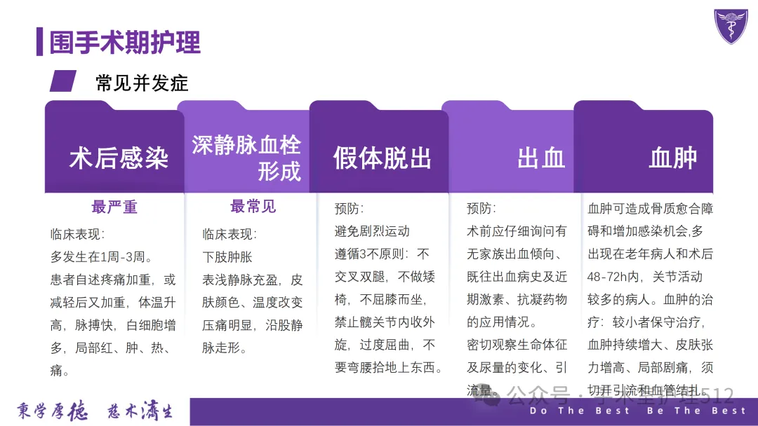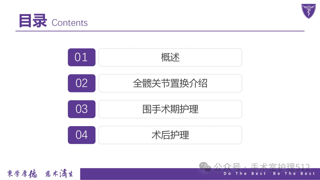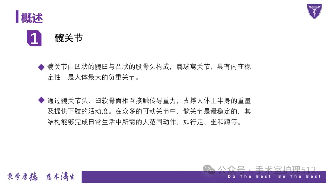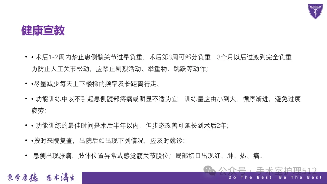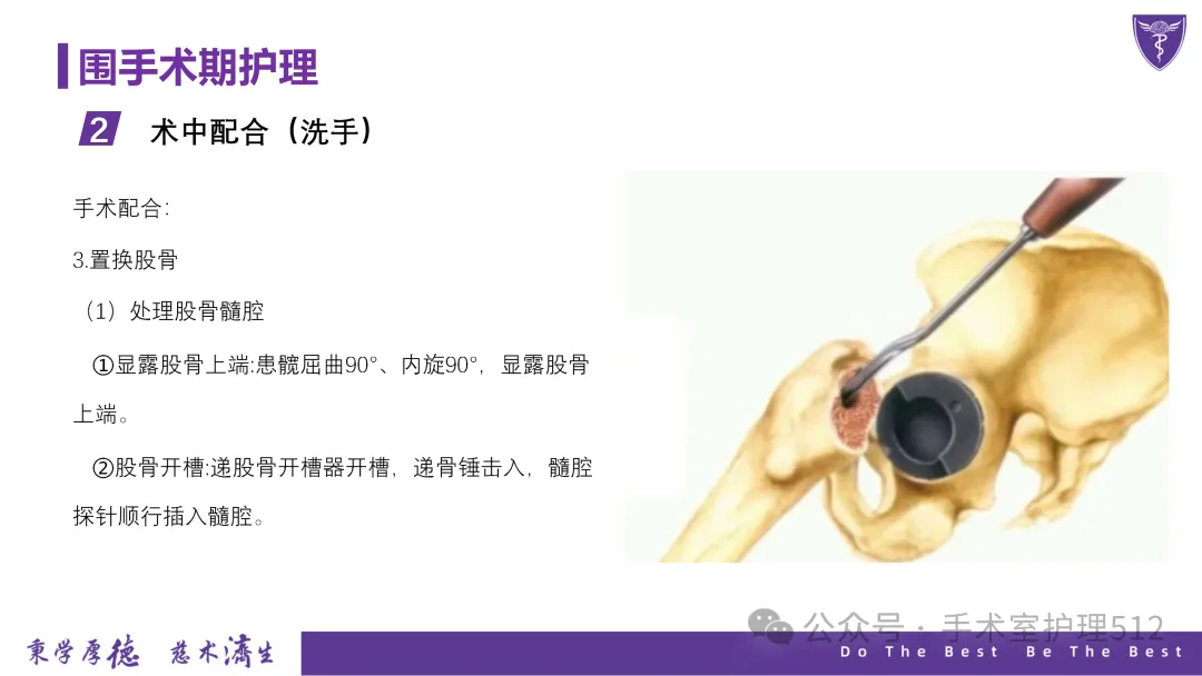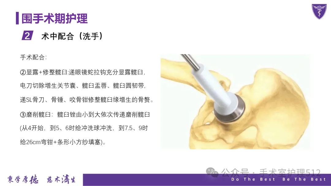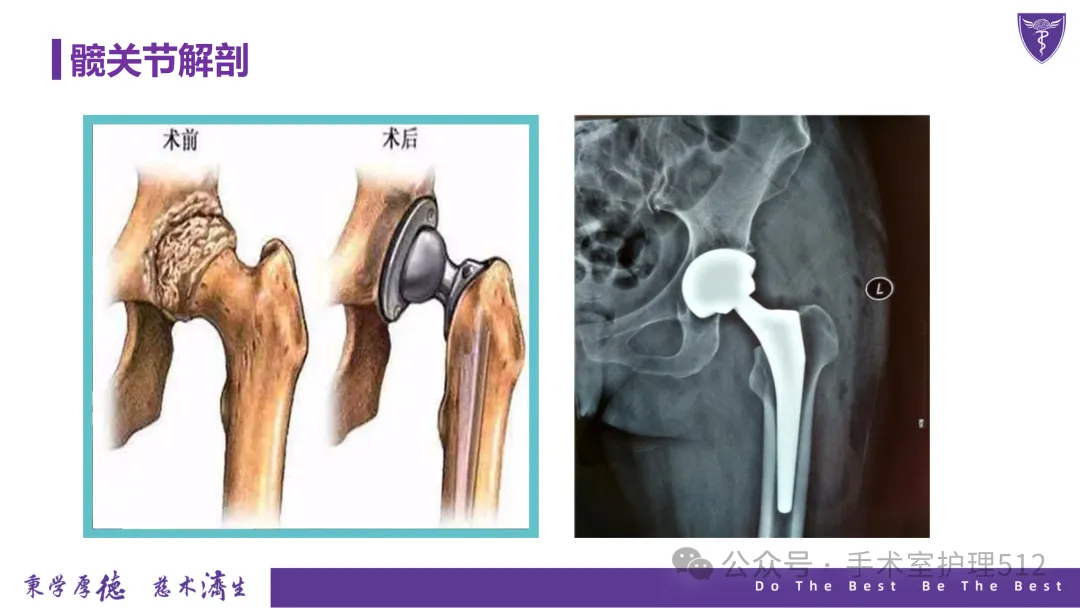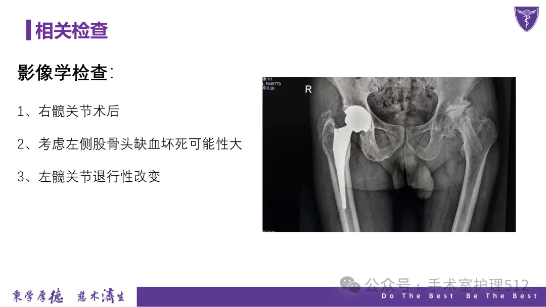 该PPT具体描述了全髋关节置换患者的围术期护理,以我院的一例具体病例介绍,围绕髋关节患者的术前护理、术中手术配合、术后护理以及康复锻炼、并发症的预防等展开介绍,尤其侧重介绍手术室工作内容,髋关节置换术的手术配合,从术前物品准备、术中巡回护士、洗手护士的配合工作,以及术后的护理重点分类做了详细介绍。此类PPT也有助于手术室的临床教学工作,帮助新入职员工在入职初期学习掌握专科知识。