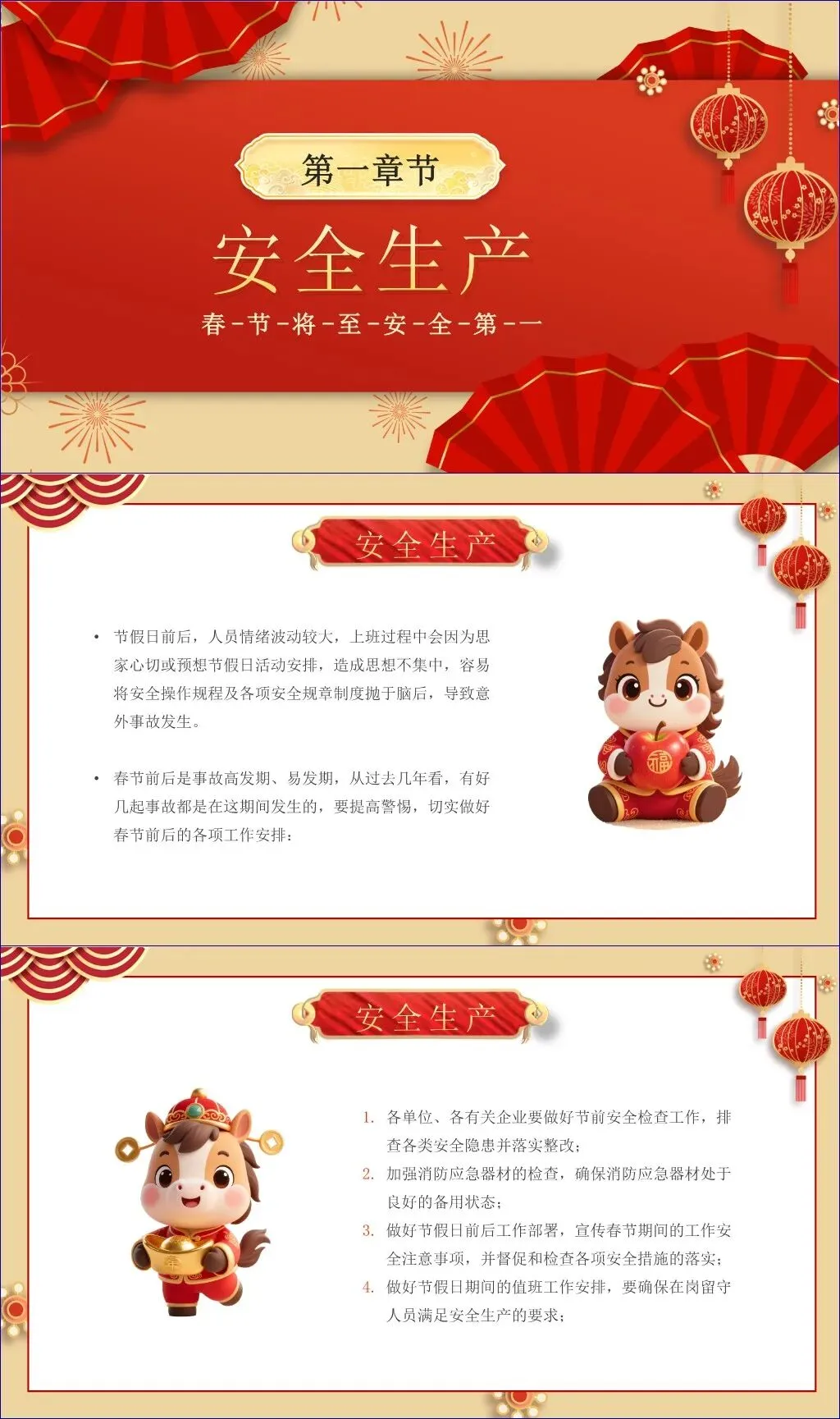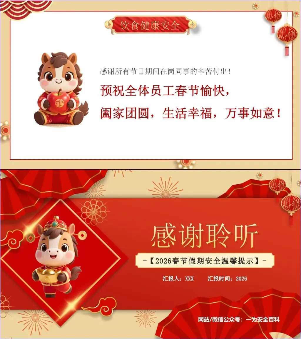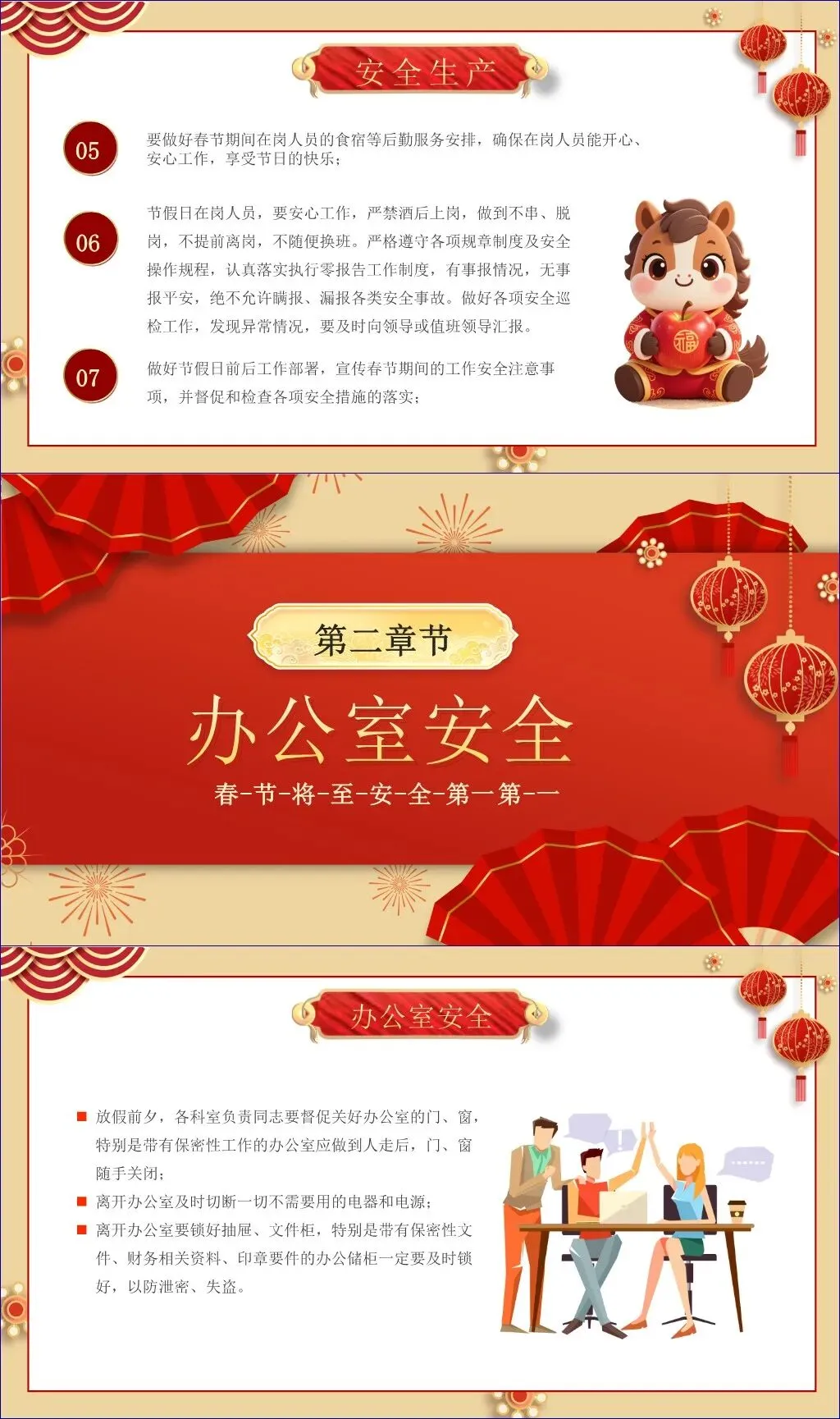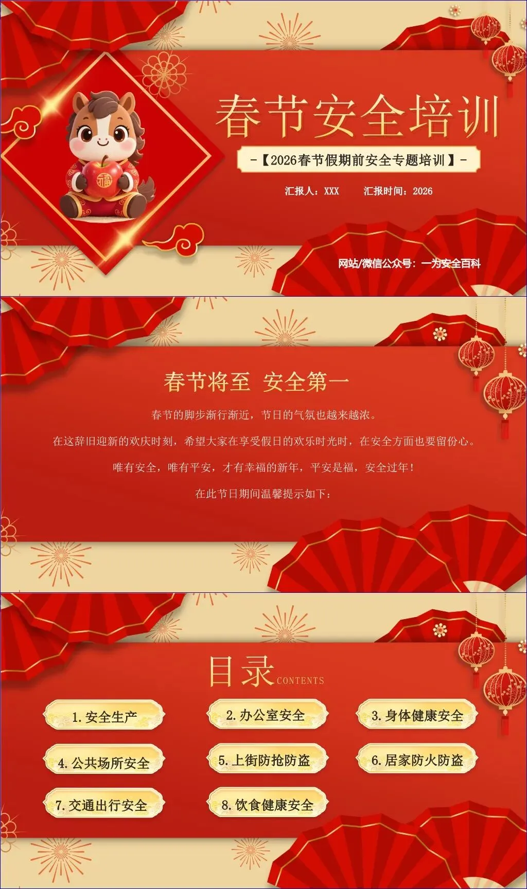 该文档是《2026春节假期前安全专题培训》PPT,旨在提醒员工和公众在春节前后注意各类安全事项,确保度过一个平安、祥和的节日。全文共分为八个章节,涵盖以下方面: