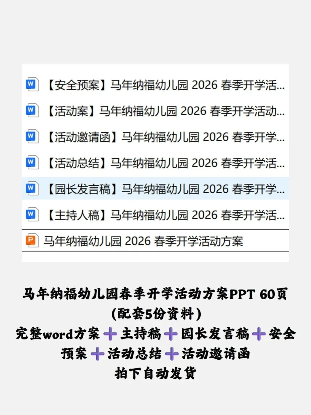 包括:完整word方案➕主持稿➕园长发言稿➕安全预案➕活动总结➕活动邀请函,拍下短信自动发货