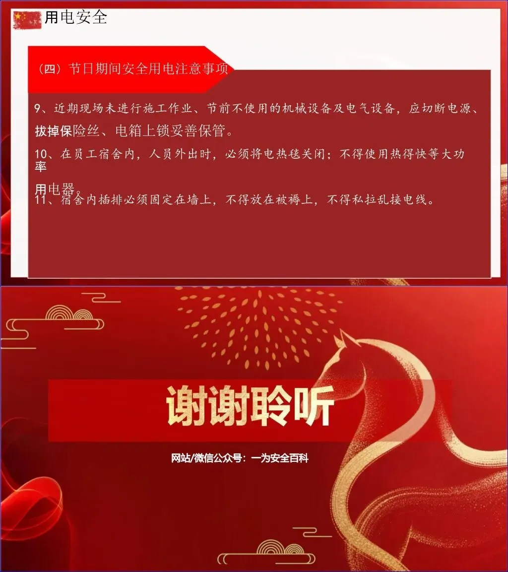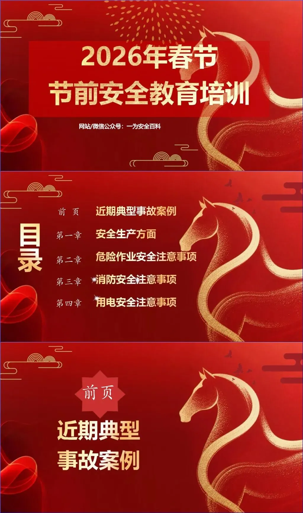 该文档是《2026年春节前安全教育培训》PPT,由“一为安全百科”提供,旨在加强节前安全生产意识、防范各类安全事故。全文分为四个主要章节,并附有大量近期典型事故案例作为警示。