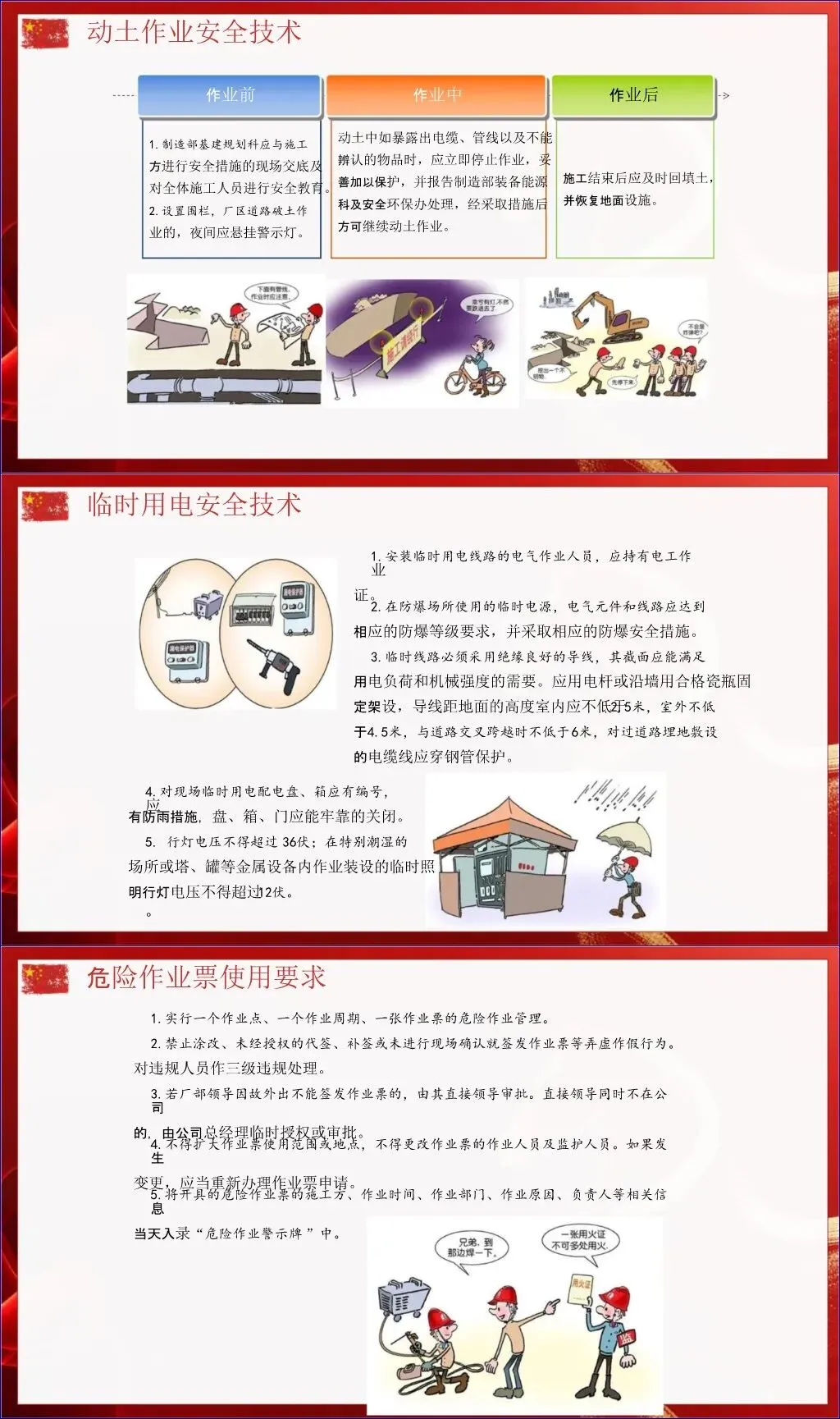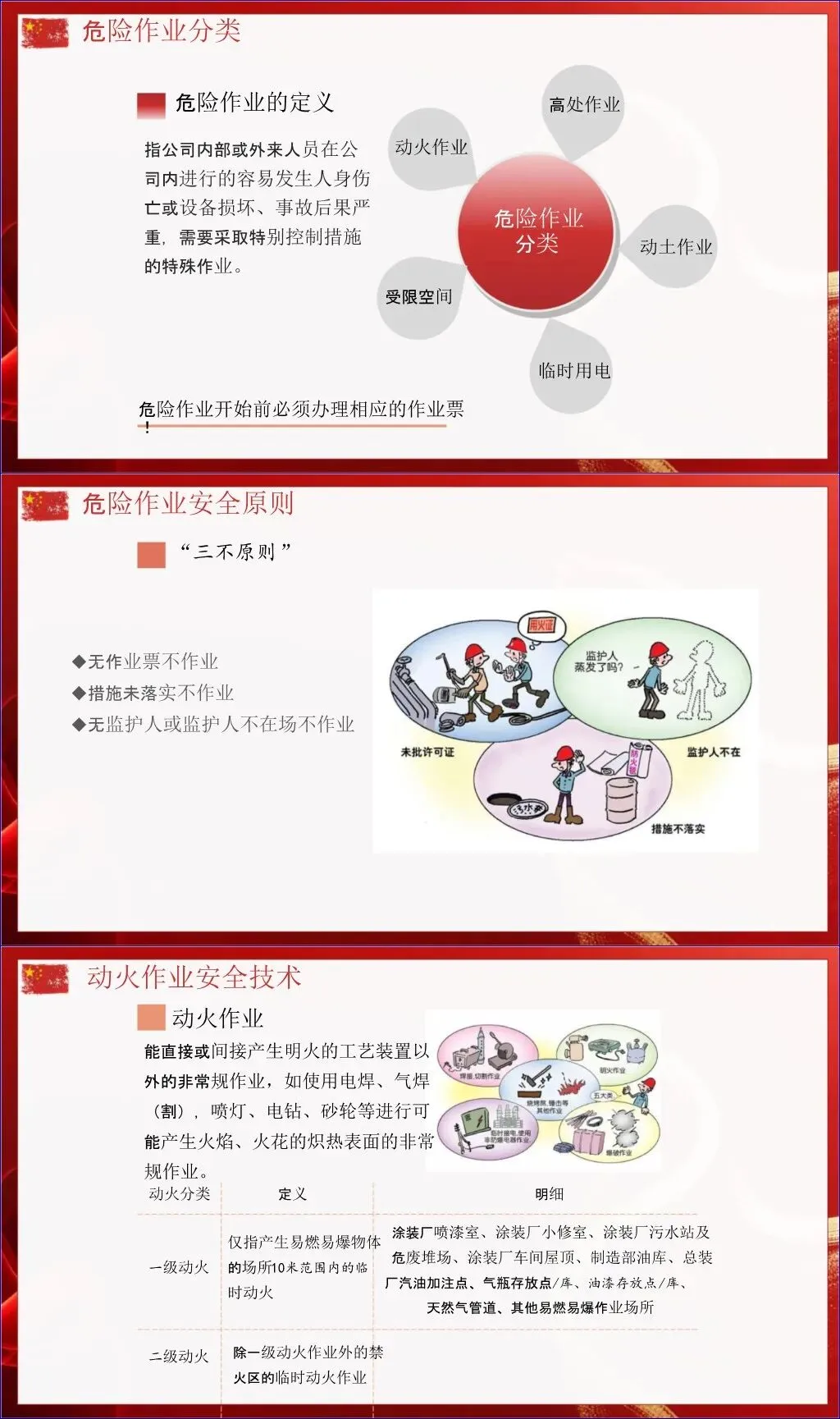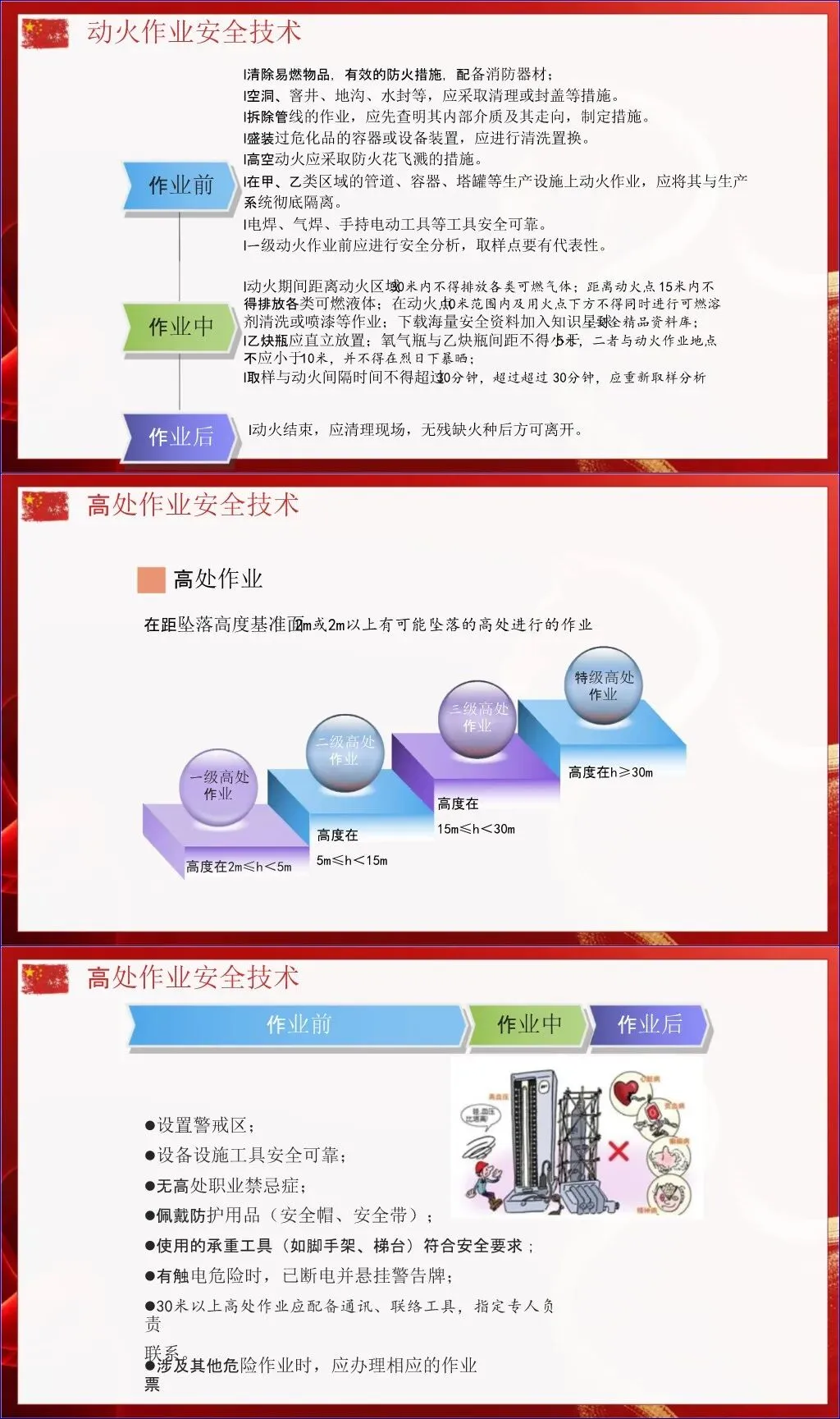 动火作业:分级管理(一级/二级),强调清理易燃物、气体检测、气瓶间距、防火花飞溅。