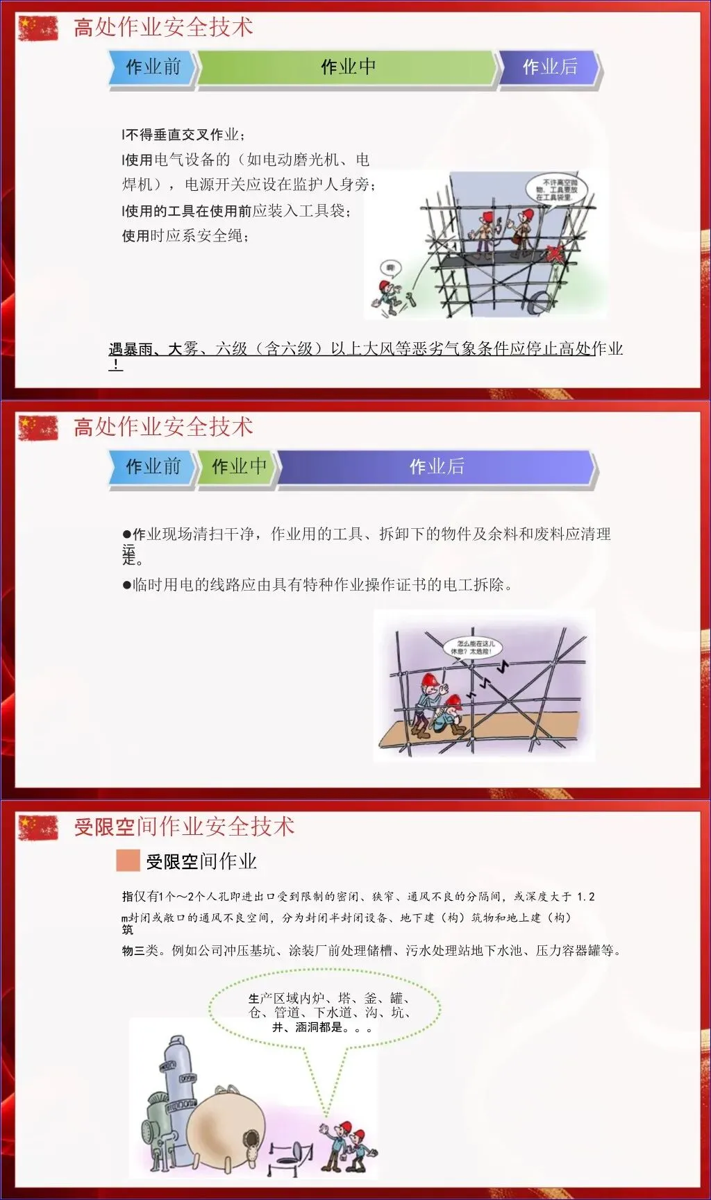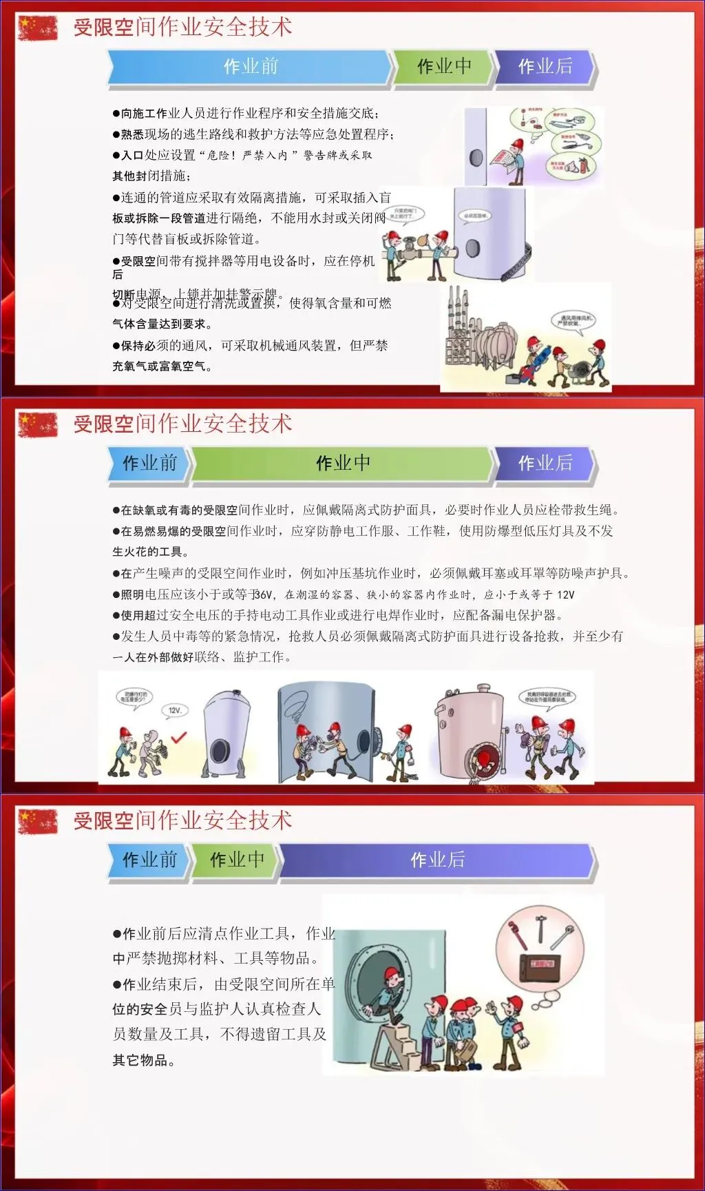 受限空间作业:必须隔离、通风、检测气体,佩戴防护面具,严禁盲目施救。
