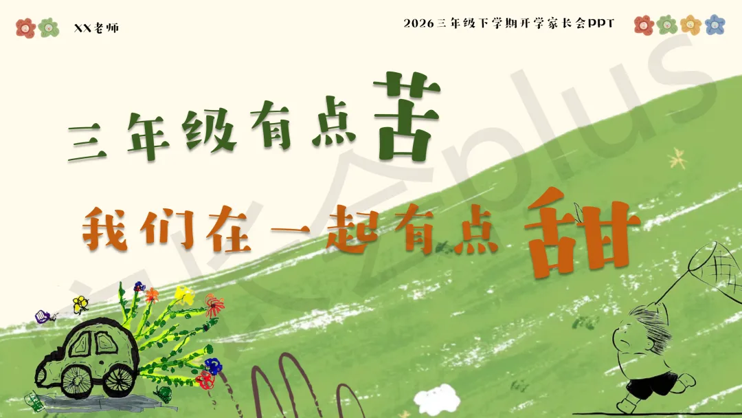 这份「小学三年级春季下学期语文开学家长会 PPT 课件《三年级有点苦,我们在一起有点甜》模板推荐(附配套发言稿)」就介绍到这里了。