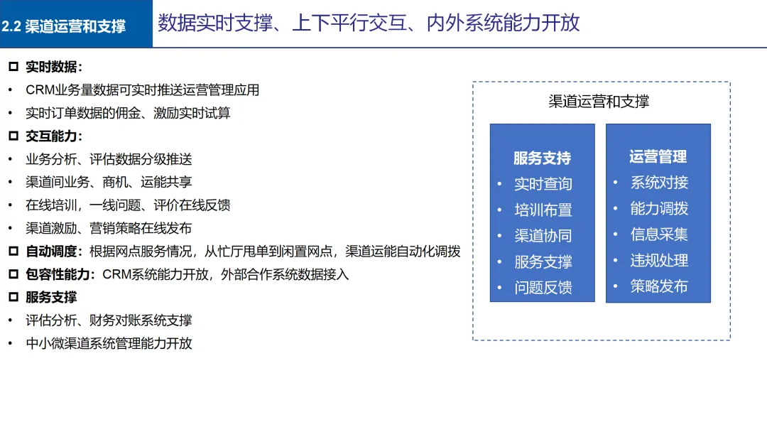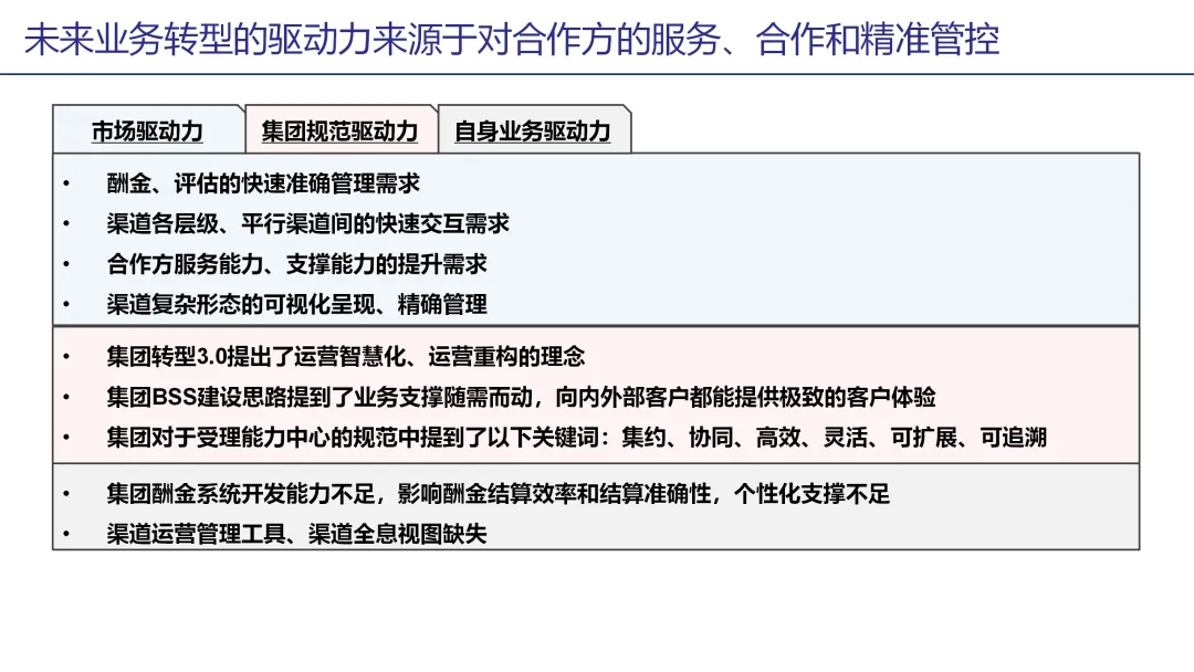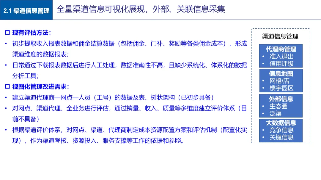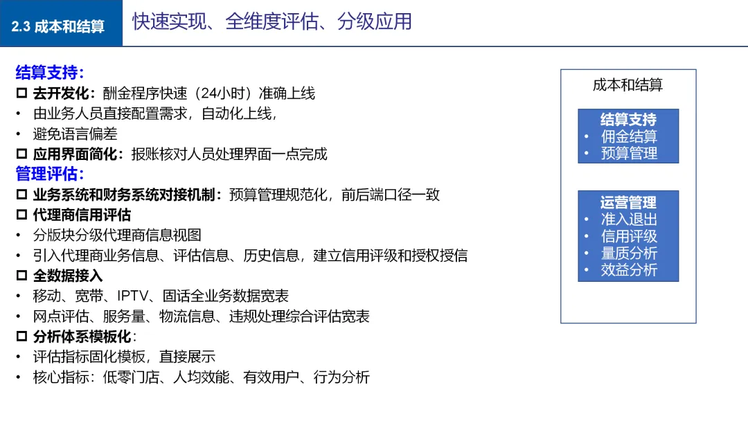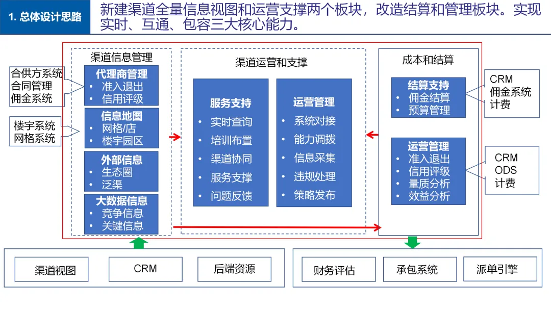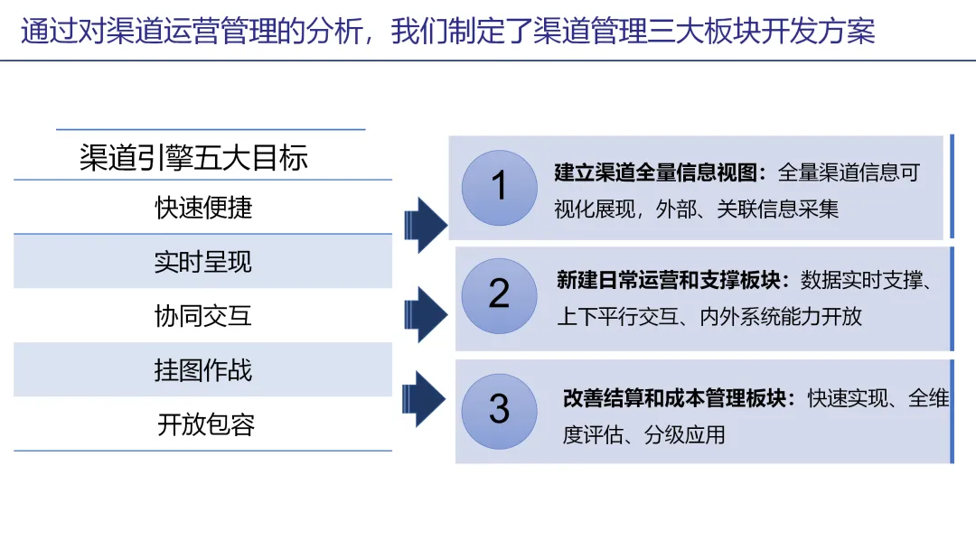 在业务设计思路上,方案提出了三大板块开发策略:改善结算和成本管理板块,通过快速实现、全维度评估与分级应用,提升结算效率与成本管控能力;新建日常运营和支撑板块,强化数据实时支撑、上下平行交互与内外系统能力开放,提升渠道运营灵活性;同时,注重渠道信息管理的全面性与精准性,通过全量渠道信息视图与代理商管理准入退出信用评级机制,确保渠道数据的准确性与完整性