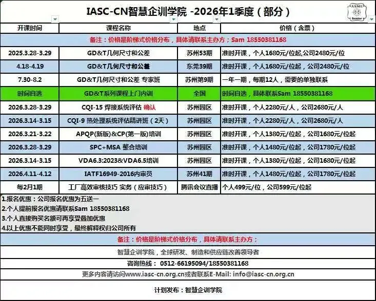 制造业培训,请认准智慧企训学院,欢迎联系Sam.yang@iasc-cn.org.cn准时开课!2024年GD&T技术专家5天班(限12位)确认开课!12.28-12.29,GD&T苏州站第46期|苹果公司声学PD团队GD&T内训圆满结束!2024.8.21-8.222025年期(总第9期)&T专家班培训 ~版权课程,2025.7.3-7.6大众汽车(中国)研发团队&一汽大众各基地GD&T高级培训合影分享华为技术&华为机器 GD&T高级培训圆满结束!福耀集团GD&T培训以及项目培训合影分享以及回顾美国卡特彼勒CAT 尺寸链公差叠加分析内训圆满结束行业巨头公牛集团[603195]GD&T培训合影分享冠军企业先临三维GD&T内训圆满结束!培训快报|大众中国发动机研发团队3天GD&T内训圆满结束!项目案例:福耀集团尺寸工程项目辅导项目圆满结束!公牛电器项目第四期:基于家电的尺寸链分析工作坊--培训圆满结束!埃梯梯科能电子(深圳)GD&T高级培训圆满结束!宾科紧固件GD&T高级实战项目-2天圆满结束!公牛集团尺寸工程咨询第一期GD&T3天培训圆满结束!兆威机电(代码:003021)GD&T高级实战项目-2天圆满结束!航天电器某公司GD&T内训圆满结束!走进世界巨头好孩子集团某研发中心,GD&T内训圆满结束!科技巨头华为集团GD&T内训圆满结束!&一汽大众全国基地GD&T培训合影三一重工常熟基地某研究院GD&T内训圆满结束!|GDT培训再次走进世界巨头卡特彼勒某研发中心,GD&T内训圆满结束!