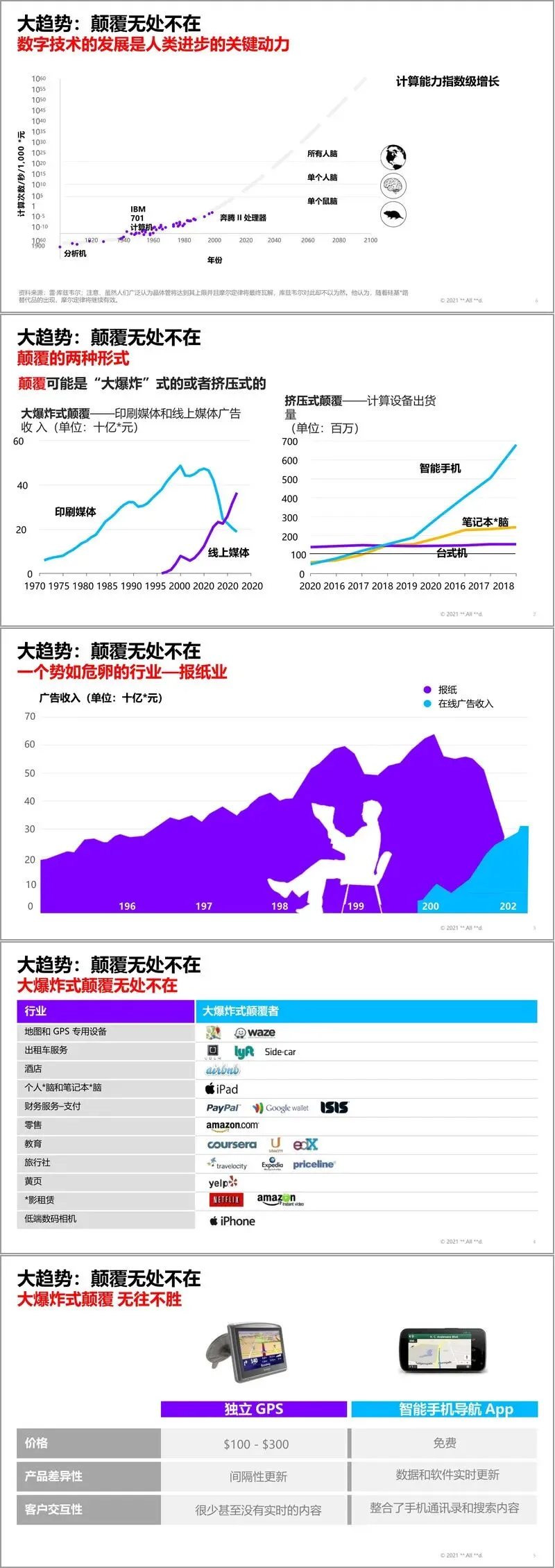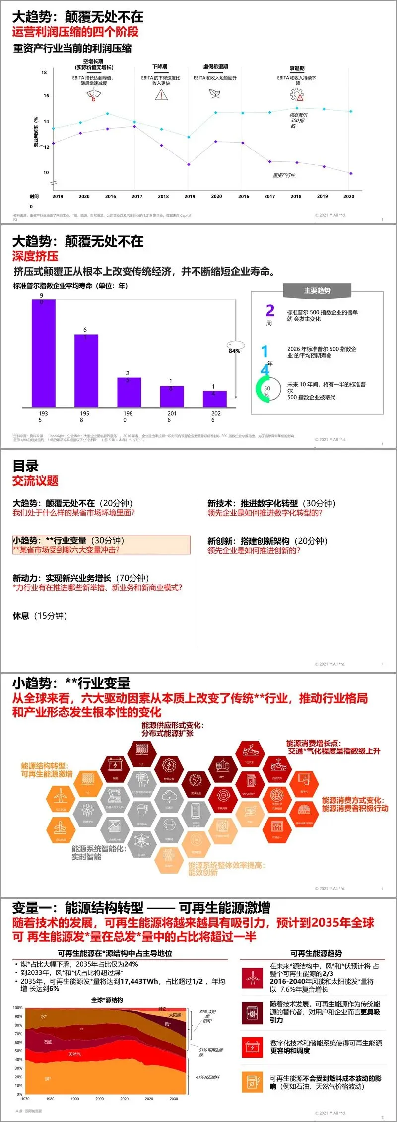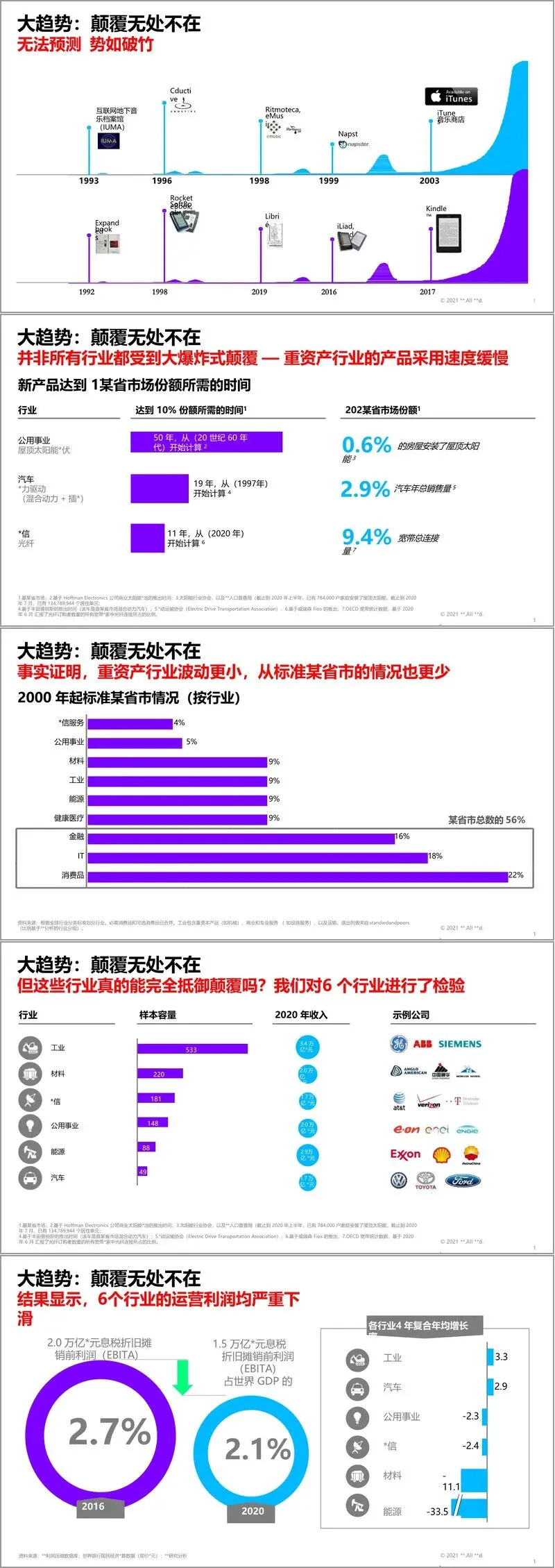 行业面临的颠覆呈现出两种形态:“大爆炸式颠覆”与“挤压式颠覆”。前者来势迅猛,彻底重塑行业格局,如线上媒体对印刷业的冲击;后者则是一种缓慢而持续的压力,逐步侵蚀传统业务的利润空间。值得注意的是,尽管能源等重资产行业因产品采用周期长而一度被视为能抵御颠覆的“堡垒”,但深入分析显示,包括工业、材料、能源、公用事业、汽车和电信在内的六大重资产行业,其运营利润均出现了严重下滑,经历了从“虚假希望期”到“衰退期”的利润压缩过程。